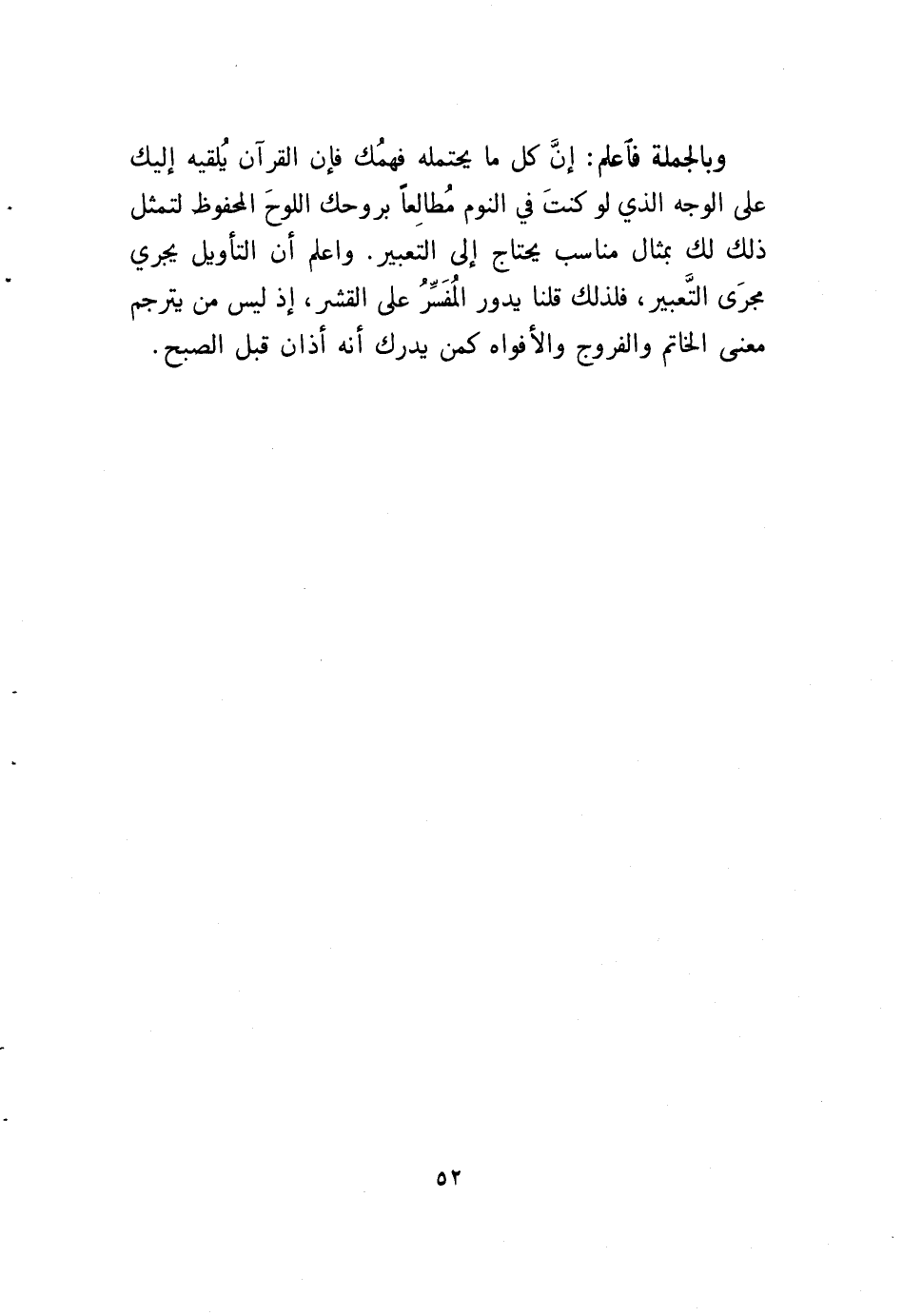 وبالجملة فاعلم: أنَّ كل ما يحتمله فهمُك فإن القرآن يُلقيه إليك على الوجه الذي لو كنتَ في النوم مُطالِعاً بروحك اللوحَ المحفوظ لتمثل ذلك لك بمثال مناسب يحتاج إلى التعبير. واعلم أن التأويل يجري مجرَى التَّعبير، فلذلك قلنا يدور المُفَسِّرُ على القشر، إذ ليس من يترجم معنى الخاتم والفروج والأفواه كمن يدرك أنه أذان قبل الصبح.