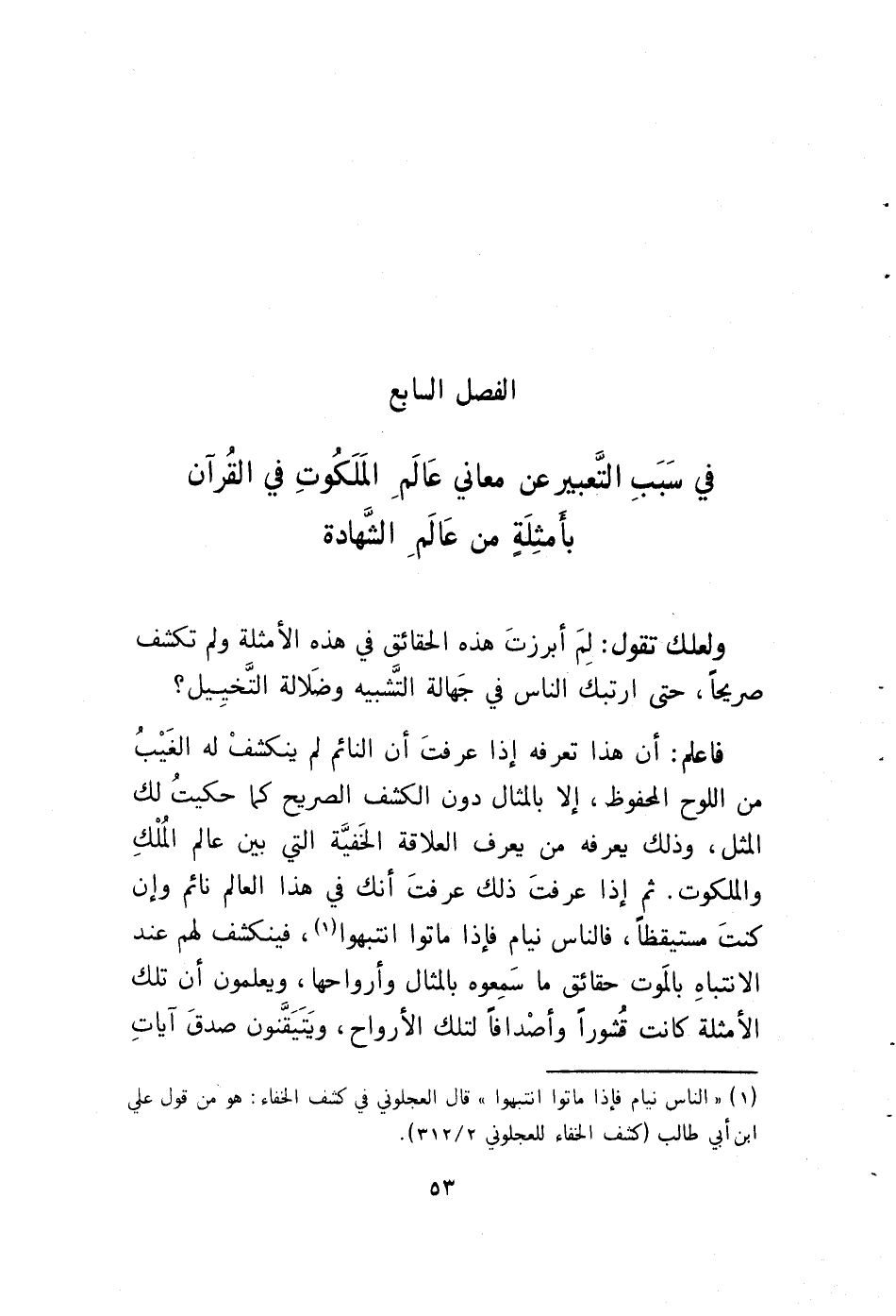 فاعلم: أن هذا تعرفه إذا عرفتَ أن النائم لم ينكشفْ له الغَيْبُ من اللوح المحفوظ، إلا بالمثال دون الكشف الصريح كما حكيتُ لك المثل، وذلك يعرفه من يعرف العلاقة الخَفيَّة التي بين عالم المُلْكِ والملكوت. ثم إذا عرفتَ ذلك عرفتَ أنك في هذا العالم نائم وإن كنتَ مستيقظاً، فالناس نيام فإذا ماتوا انتبهوا، فنكشف لهم عند الانتباهِ بالمَوت حقائق ما سَمِعوه بالمثال وأرواحها، ويعلمون أن تلك الأمثلة كانت قُشوراً وأصْدافاً لتلك الأرواح، ويَتَيَقَّنون صدقَ آياتِ