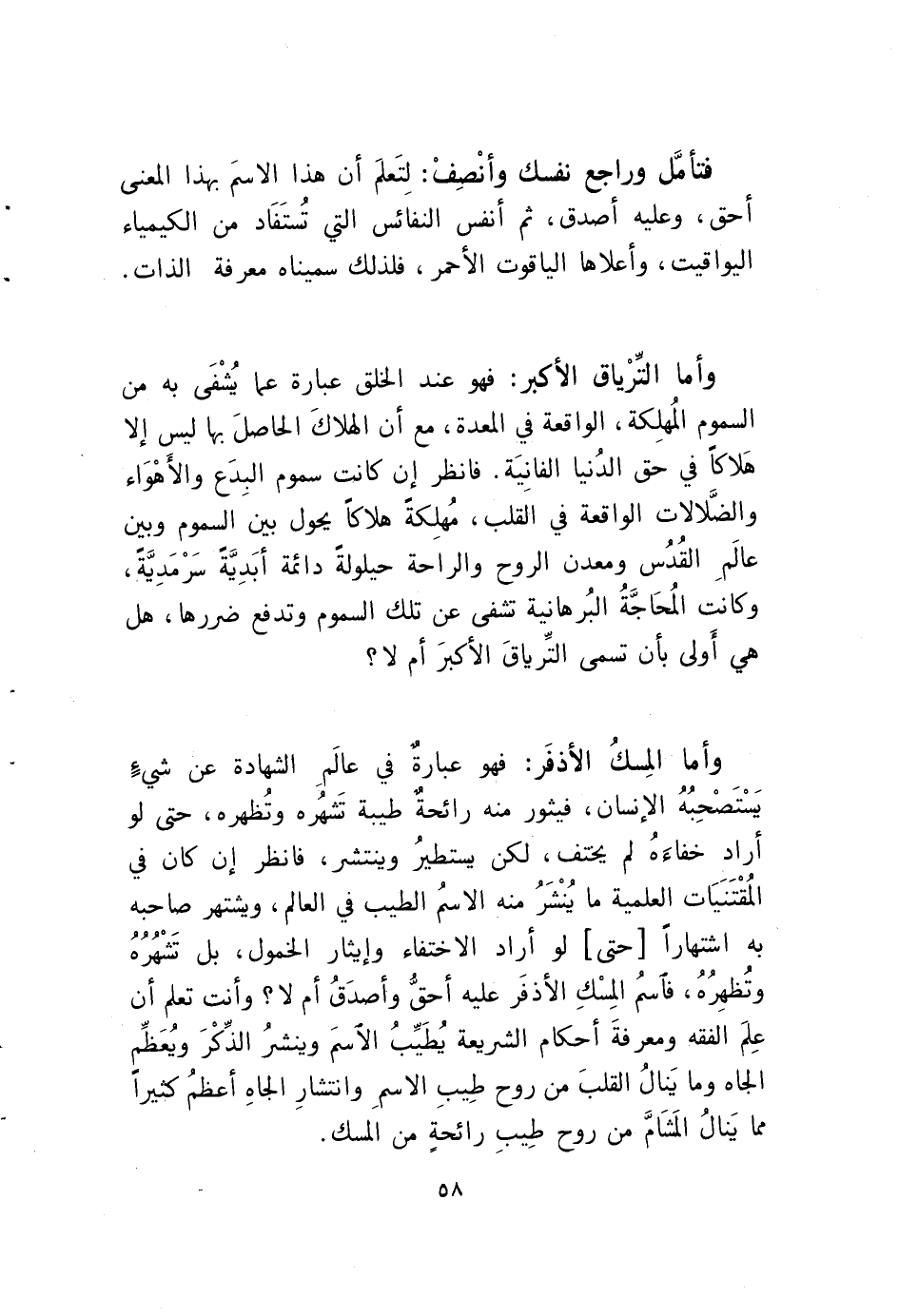 فتأمَّل وراجع نفسك وانْصِفْ: لِتَعلمَ أن هذا الاسمَ بهذا المعنى أحق، وعليه أصدق، ثم أنفس النفائس التي تُستَفَاد من الكيمياء اليواقيت، وأعلاها الياقوت الأحمر، فلذلك سميناه معرفة الذات.