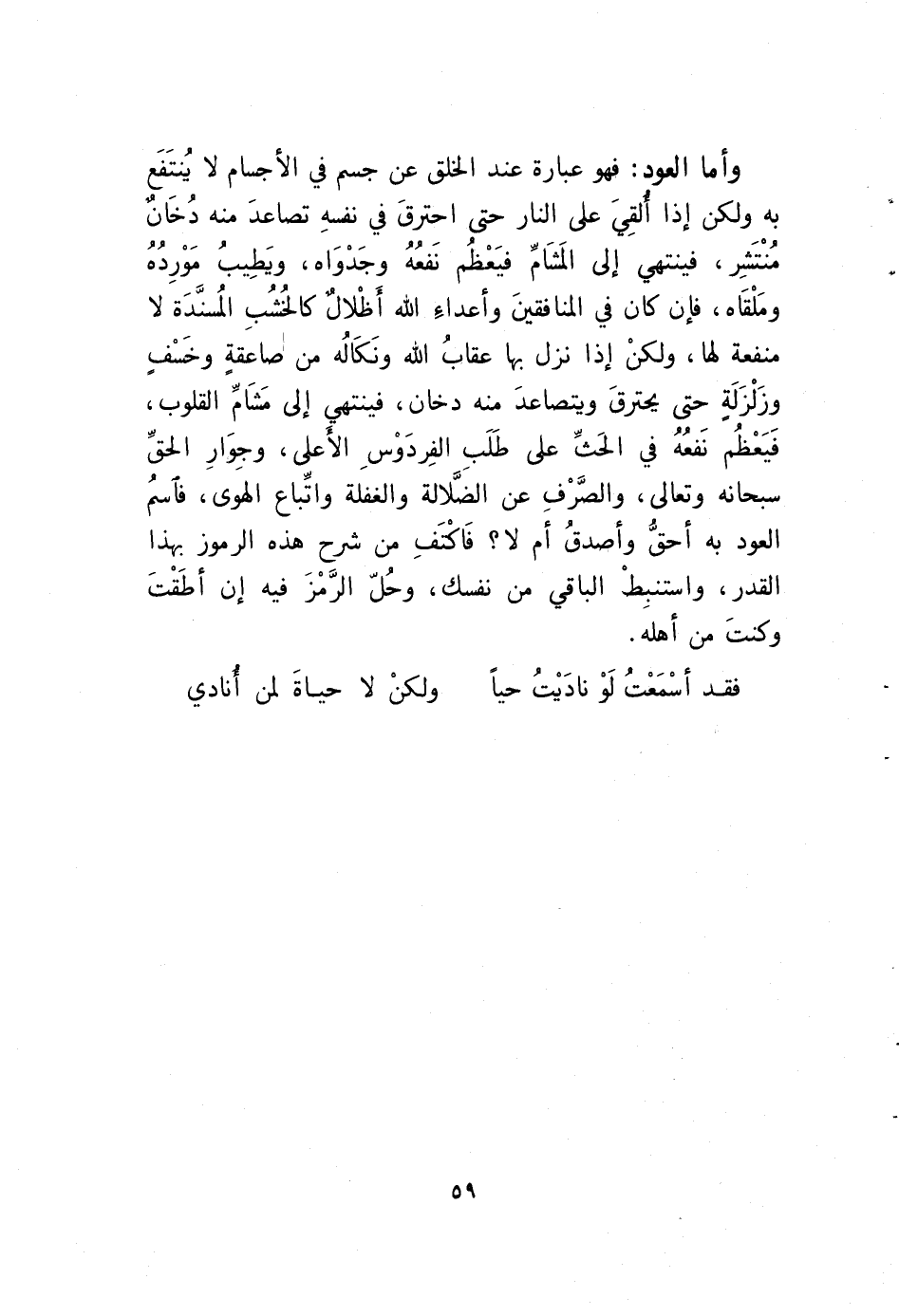 وأما العود: فهو عبارة عند الخلق عن جسم في الأجسام لا يُنتَفَع به ولكن إذا أُلقِيَ على النار حتى احترقَ في نفسهِ تصاعدَ منه دُخَانٌ مُنْتَشِر، فينتهي إلى المَشَامِّ فيَعْظُم نَفعُهُ وجَدْوَاه، ويَطِيبُ مَوْرِدُهُ ومَلْقَاه، فإن كان في المنافقينَ وأعداءِ الله أَظْلالٌ كالخُشُبِ المُسنَّدَة لا منفعة لها، ولكنْ إذا نزل بها عقابُ الله ونَكَالُه من صاعقةٍ وخَسْفٍ وزَلْزَلَةٍ حتى يحترقَ ويتصاعدَ منه دخان، فينتهي إلى مَشَامِّ القلوب، فَيَعْظُم نَفعُهُ في الحَثِّ على طَلَبِ الفِردَوْسِ الأَعلى، وجِوَارِ الحقِّ سبحانه وتعالى، والصَّرْفِ عن الضَّلالة والغفلة واتِّباع الهوى، فاسمُ العود به أحقُّ وأصدقُ أم لا؟ فَاكْتَفِ من شرح هذه الرموز بهذا القدر، واستنبِطْ الباقي من نفسك، وحُلّ الرَّمْزَ فيه إن أطَقْتَ وكنتَ من أهله.