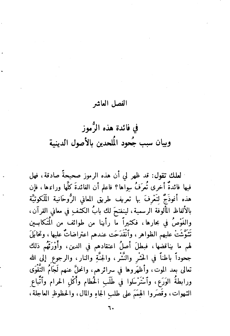 لعلك تقول: قد ظهر لي أن هذه الرموز صحيحةً صادقة، فهل فيها فائدةٌ أخرى تُعرَفُ سِواها؟ فاعلم أن الفائدةَ كلَّها وراءَها، فإن هذه أنموذَجٌ لِتَعْرِفَ بها تعريف طريق المعاني الرُّوحَانية المَلَكوتيَّة بالألفاظ المألوفة الرسمية، لينفتحَ لك بابُ الكشفِ في معاني القرآن، والغَوْصُ في بحارها، فكثيراً ما رأينا من طوائف من المُتَكابسين تَشَوَّشَتْ عليهم الظواهر، وانْقَدَحَت عندهم اعتراضاتٌ عليها، وتخايَلَ لهم ما يناقضها، فبطلَ أصلُ اعتقادهم في الدين، وأَوْرَثَهُم ذلك جحوداً باطناً في الحَشْرِ والنَّشْر، والجنَّةِ والنار، والرجوعِ إلى الله تعالى بعد الموت، وأظهَروها في سرائرهم، وانحلَّ عنهم لَجَامُ التَّقْوَى ورابطةُ الوَرَع، واسْتَرْسَلوا في طَلَبِ الحُطام وأَكْلِ الحرام واتِّباعِ الشهوات، وقَصَروا الهِمَمَ على طلبِ الجاهِ والمال، والحظوظِ العاجلة،