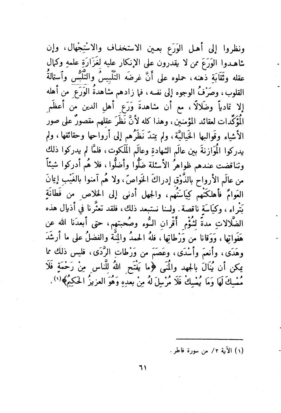ونظروا إلى أهل الوَرَع بعين الاستخفاف والاسْتِجْهال، وإن شاهدوا الوَرَع ممن لا يقدرون على الإنكار عليه لِغَزَارَةِ علمهِ وكمال عقله وثَقَابَةِ ذهنه، حملوه على أَنَّ غرضَه التَّلْبِيسُ والتَّلبُّس واستمالةُ القلوب، وصَرْفُ الوجوه إلى نفسه، فما زادهم مشاهدةُ الوَرعِ من أهله إلا تمادياً وضَلالاً، مع أن مشاهدةَ وَرَعِ أهلِ الدين من أعظَمِ المُؤَكِّدات لعقائد المؤمنين، وهذا كله لأنَّ نَظَرَ عقلِهم مقصورٌ على صور الأشياء وقَوالبها الخَياليَّة، ولم يمتدّ نَظَرُهم إلى أرواحها وحقائقها، ولم يدركوا المُوَازنةَ بين عالَمِ الشهادةِ وعالَم المَلَكوت، فلمَّا لم يدركوا ذلك وتناقضت عندهم ظواهرُ الأسئلة ضَلُّوا وأضلُّوا، فلا هُم أدركوا شيئاً من عالَم الأرواح بالذَّوْقِ إدراكَ الخَواصّ، ولا هُم آمنوا بالغَيْبِ إيمانَ العَوامِّ فأهلكَتْهم كِيَاسَتُهم، والجهل أدنى إلى الخلاصِ من فَطانَةٍ بَتْراء، وكيَاسَةٍ ناقصة. ولسنا نستبعد ذلك، فلقد تعثَّرنا في أذيال هذه الضَّلالاتِ مدةً لِشُؤْمِ أَقْرانِ السُّوء وصُحبتهم، حتى أبعدَنا الله عن هَفَواتِها، وَوَقانا من وَرْطاتِها، فلهُ الحمدُ والمِنَّة والفضلُ على ما أرشَدَ وهَدَى، وأنعمَ وأسْدَى، وعَصَمَ من وَرْطاتِ الرَّدَى، فليس ذلك مما يمكن أن يُنَالَ بالجهد والمُنَى {مَّا يَفْتَحِ الله لِلنَّاسِ مِن رَّحْمَةٍ فَلاَ مُمْسِكَ لَهَا وَمَا يُمْسِكْ فَلاَ مُرْسِلَ لَهُ مِن بَعْدِهِ وَهُوَ العزيز الحكيم} .