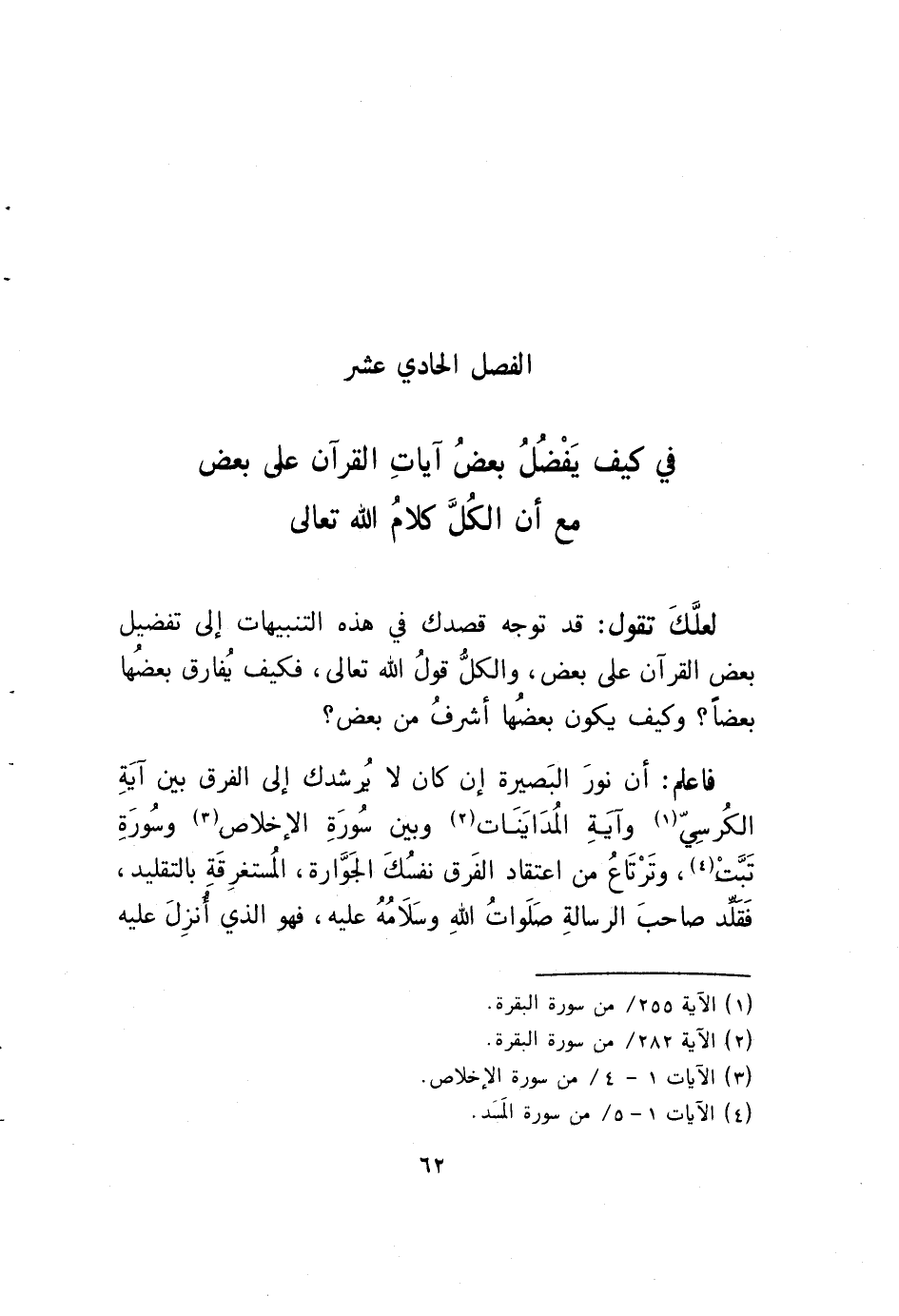 فاعلم: أن نورَ البَصيرة إن كان لا يُرشدك إلى الفرق بين آيَةِ الكُرسِيّ وآيَةِ المُدَايَنَات وبين سُورَةِ الإخلاص وسُورَةِ تَبَّتْ، وتَرْتَاعُ من اعتقاد الفَرق نفسُكَ الجَوَّارة، المُستغرِقَةِ بالتقليد، فَقَلِّد صاحبَ الرسالةِ صَلَواتُ اللهِ وسَلاَمُهُ عليه، فهو الذي أُنزِلَ عليه