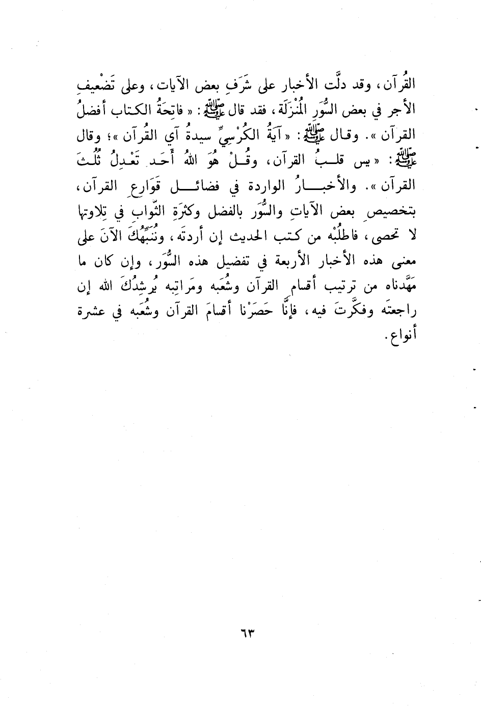 القُرآن، وقد دلَّت الأخبار على شَرَفِِ بعض الآيات، وعلى تَضْعيفِ الأجر في بعض السُّوَرِ المُنْزَلَة، فقد قال صَلَّى اللَّهُ عَلَيْهِ وَسَلَّمَ: "فاتِحَةُ الكتاب أفضلُ القرآن". وقال صَلَّى اللَّهُ عَلَيْهِ وَسَلَّمَ: "آيةُ الكُرْسِيِّ سيدةُ آي القُرآن"؛ وقال صَلَّى اللَّهُ عَلَيْهِ وَسَلَّمَ: "يس قلبُ القرآن، وقُلْ هُوَ اللهُ أَحَد تَعْدِلُ ثُلُثَ القرآن". والأخبارُ الواردة في فضائل قَوَارعِ القرآن، بتخصيصِ بعض الآياتِ والسُّوَر بالفضل وكثرَةِ الثّوابِ في تِلاوتها لا تحصى، فاطلُبْه من كتب الحديث إن أردتَه، ونُنَبِّهُكَ الآنَ على معنى هذه الأخبار الأربعة في تفضيل هذه السُّوَر، وإن كان ما مَهَّدناه من ترتيب أقسامِ القرآن وشُعَبه ومَراتِبه يُرشِدُكَ الله إن راجعتَه وفكَّرتَ فيه، فإنَّ حَصَرْنا أقسامَ القرآن وشُعَبه في عشرة أنواع.
