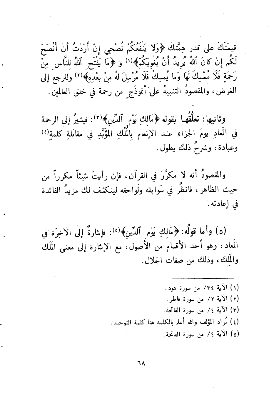 (5) وأما قولُه: {مالك يَوْمِ الدين} : فإشارةٌ إلى الآخِرَة في المَعاد، وهو أحد الأقسام من الأصول، مع الإشارة إلى معنى المَلَك والمَلِك، وذلك من صفات الجلال.