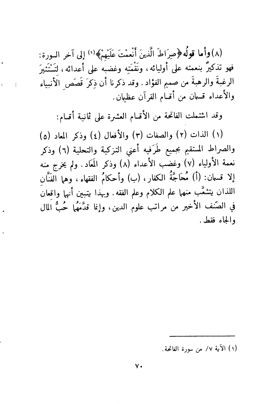 (1) الذات (2) والصفات (3) والأفعال (4) وذكر المعاد (5) والصراط المستقيم بجميع طَرَفيه أعني التزكية والتحلية (6) وذكر نعمة الأولياء (7) وغضب الأعداء (8) وذكر المَعَاد. ولم يخرج منه إلا قسمان: (أ) مُحَاجَّةُ الكفار، (ب) وأحكامُ الفقهاء، وهما الفَنَّانِ اللذان يتشعَّب منهما علم الكلام وعلم الفقه. وبهذا يتبين أنهما واقِعان في الصنّف الأخير من مراتب علوم الدين، وإنما قدَّمَهُما حُبُّ المال والجاه فقط.
