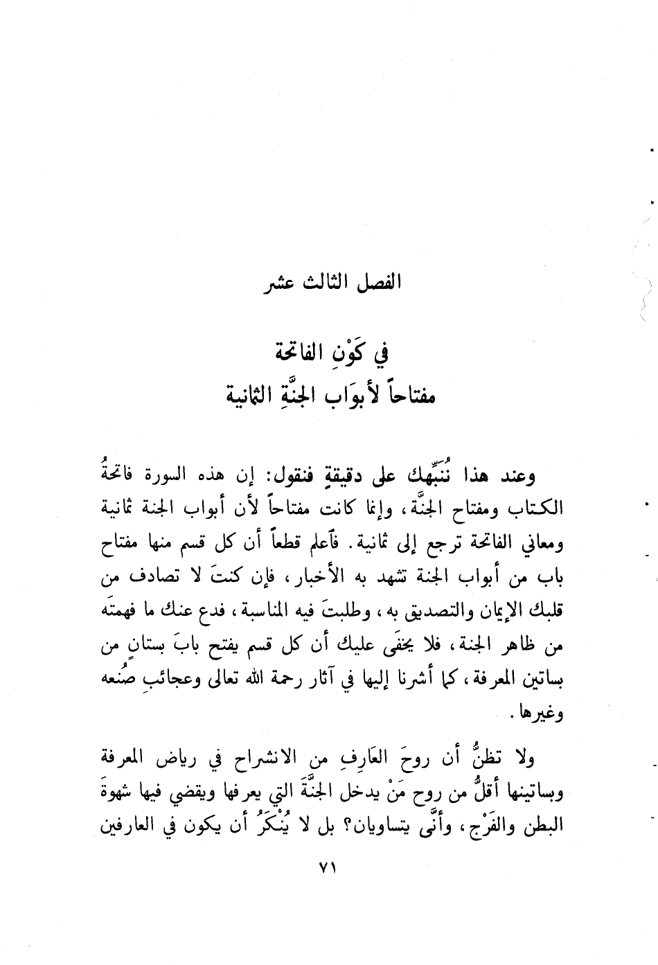 وعند هذا نُنَبِّهك على دقيقةٍ فنقول: إن هذه السورة فاتحةُ الكتاب ومفتاح الجنَّة، وإنما كانت مفتاحاً لأن أبواب الجنة ثمانية ومعاني الفاتحة ترجع إلى ثمانية. فاعلم قطعاً أن كل قسم منها مفتاح باب من أبواب الجنة تشهد به الأخبار، فإن كنتَ لا تصادف من قلبك الإيمان والتصديق به، وطلبتَ فيه المناسبة، فدع عنك ما فهمتَه من ظاهر الجنة، فلا يخفَى عليك أن كل قسم يفتح بابَ بستانٍ من بساتين المعرفة، كما أشرنا إليها في آثار رحمة الله تعالى وعجائبِ صُنعه وغيرها.