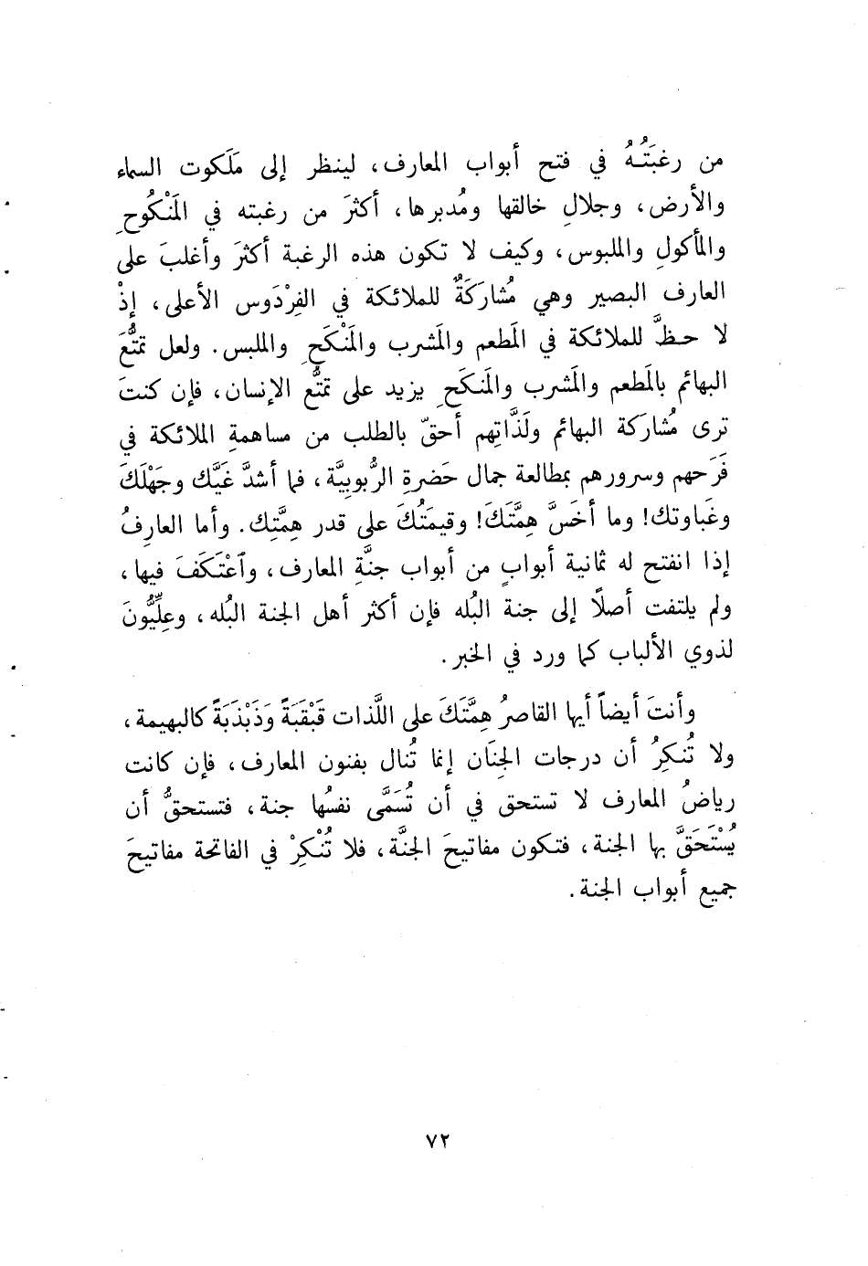 من رغبَتُهُ في فتح أبواب المعارف، لينظر إلى مَلَكوت السماء والأرض، وجلالِ خالقها ومُدبرها، أكثرَ من رغبته في المَنْكُوحِ والمأكولِ والملبوس، وكيف لا تكون هذه الرغبة أكثرَ وأغلبَ على العارف البصير وهي مُشارَكَةٌ للملائكة في الفِرْدَوس الأعلى، إِذْ لا حظَّ للملائكة في المَطعم والمَشرب والمَنْكَحِ والملبس. ولعل تمتُّعَ البهائم بالمَطعم والمَشرب والمَنكَحِ يزيد على تمتُّع الإنسان، فإن كنتَ ترى مُشاركة البهائم ولَذَّاتِهم أحقّ بالطلب من مساهمةِ الملائكة في فَرَحهم وسرورهم بمطالعة جمال حَضرةِ الرُّبوبِيَّة، فما أشدَّ غَيَّك وجَهْلَكَ وغَباوتك! وما أخَسَّ هِمَّتَكَ! وقيمَتُكَ على قدر هِمَّتِك. وأما العارِفُ إذا انفتح له ثمانية أبوابٍ من أبواب جنَّةِ المعارف، واعْتَكَفَ فيها، ولم يلتفت أصلاً إلى جنة البُله فإن أكثر أهل الجنة البُله، وعِلِّيُّونَ لذوي الألباب كما ورد في الخبر.