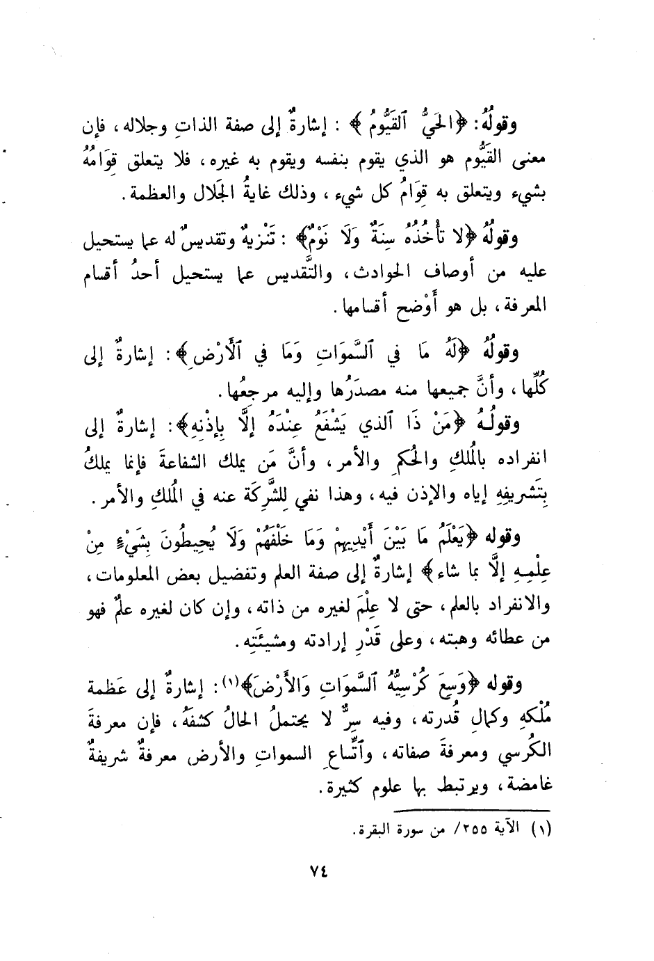 وقوله {وَسِعَ كُرْسِيُّهُ السماوات والأرض} : إشارةٌ إلى عَظمة مُلْكهِ وكمالِ قُدرته، وفيه سِرٌّ لا يحتملُ الحالُ كشفَهُ، فإن معرفةَ الكُرسي ومعرفةَ صفاته، واتِّساعِ السماواتِ والأرض معرفةٌ شريفةٌ غامضة، ويرتبط بها علوم كثيرة.