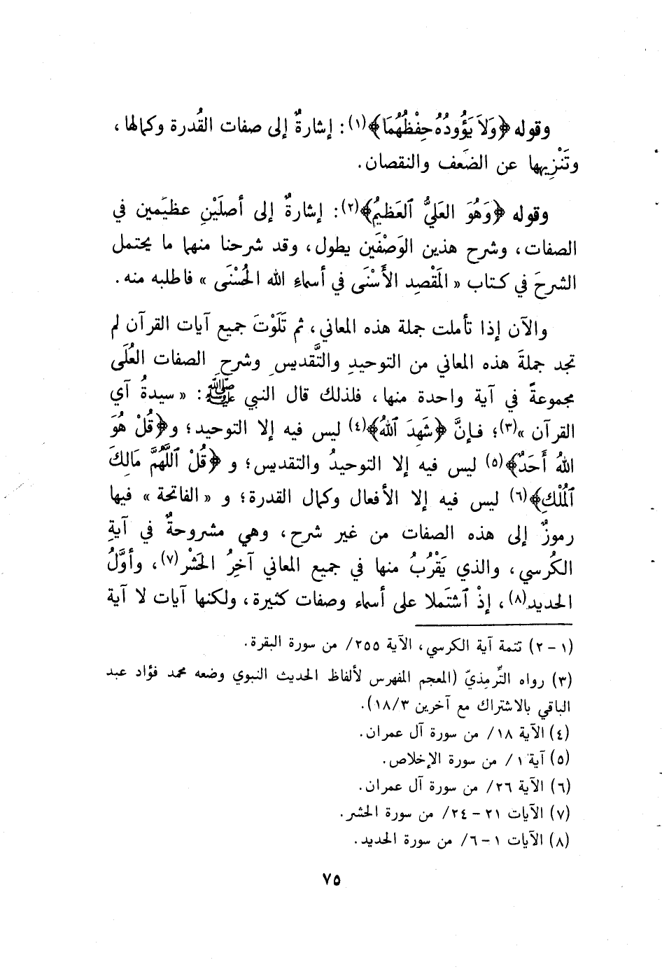 والآن إذا تأملت جملة هذه المعاني، ثم تَلَوْتَ جميع آيات القرآن لم تجد جملةَ هذه المعاني من التوحيدِ والتَّقديسِ وشرح الصفات العُلَى مجمعةً في آية واحدة منها، فلذلك قال النبي صَلَّى اللَّهُ عَلَيْهِ وَسَلَّمَ: "سيدةٌ آي القرآن"؛ فإنَّ {شَهِدَ الله} ليس فيه إلا التوحيد؛ و {قُلْ هُوَ الله أَحَدٌ} ليس فيه إلا التوحيدُ والتقديس؛ و {قُلِ اللهم مَالِكَ الملك} ليس فيه إلا الأفعال وكمال القدرة؛ و"الفاتحة" فيها رموزٌ إلى هذه الصفات من غير شرح، وهي مشروحةٌ في آية الكُرسي، والذي يَقْرُبُ منها في جميع المعاني آخِرُ الحَشْر، وأوَّلُ الحديد، إذْ اشتَملا على أسماء وصفات كثيرة، ولكنها آيات لا آية