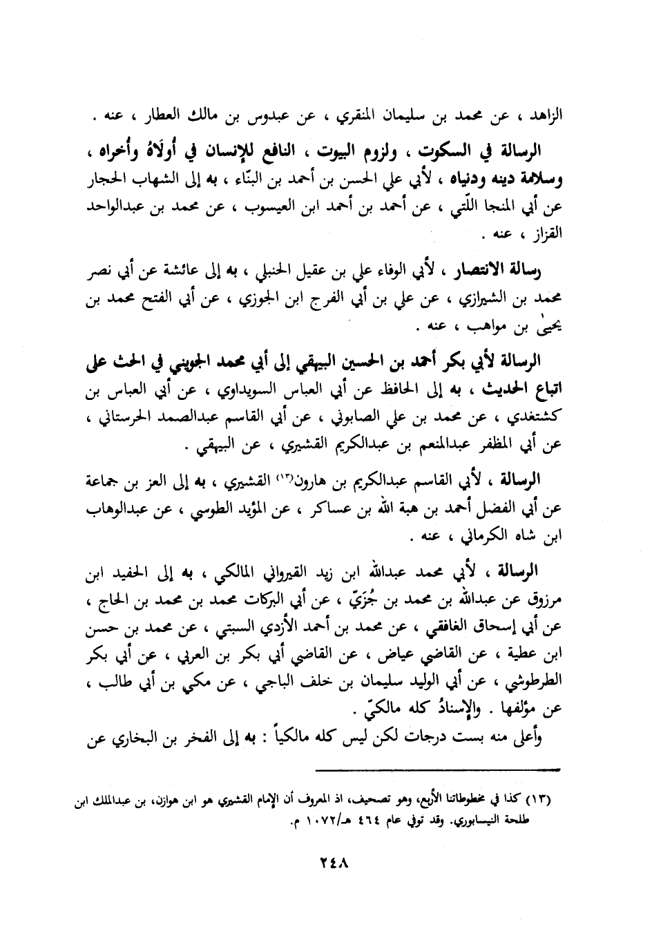 الزاهد عن محمد بن سليمان المنقري عن عبدوس بن مالك العطار عنه. الرسالة في السكوت ولزوم البيوت النافع للانسان في اولاه واخراه وسلامة دينه ودنياه لأبي علي الحسن بن احمد بن البناء به الي الشهاب الحجار عن ابي المنجا اللتي عن احمد بن احمد ابن العيسوب عن محمد بن عبد الواحد القزاز عنه. رسالة الانتصار لأبي الوفاء علي بن عقيل الحنبلي به الي عائشة عن ابي نصر محمد بن الشيرازي عن علي بن ابي الفرج ابن الجوزي عن ابي الفتح محمد بن يحيي بن مواهب عنه. الرسالة لأبي بكر احمد بن الحسين البيهقي الي ابي محمد الجويني في الحث علي اتباع الحديث به الي الحافظ عن ابي العباس السويداوي عن ابي العباس بن كشتغدي عن محمد بن علي الصابوني عن ابي القاسم عبد الصمد الحرستاني عن ابي المظفر عبد المنعم بن عبد الكريم القشيري عن البيهقي الرسالة لأبي القاسم عبد الكريم بن هارون القشيري به الي العز بن جماعة عن ابي الفضل احمد بن هبة الله بن عساكر عن المؤيد الطوسي عن عبد الوهاب ابن شاه الكرماني عنه. الرسالة لأبي محمد عبد الله ابن زيد القيرواني المالكي به الي الحفيد ابن مرزوق عن عبد الله بن محمد بن جزي عن ابي البركات محمد بن محمد بن الحاج عن ابي اسحاق الغافقي عن محمد بن احمد الازدي السبتي عن محمد بن حسن ابن عطية عن القاضي عياض عن القاضي ابي بكر بن العربي عن ابي بكر الطرطوشي عن ابي الوليد سليمان بن خلف الباجي عن مكي بن ابي طالب عن مؤلفها والاسناد كله مالكي. واعلي منه بست درجات لكن ليس كله مالكيا به الي الفخر بن البخاري عن
