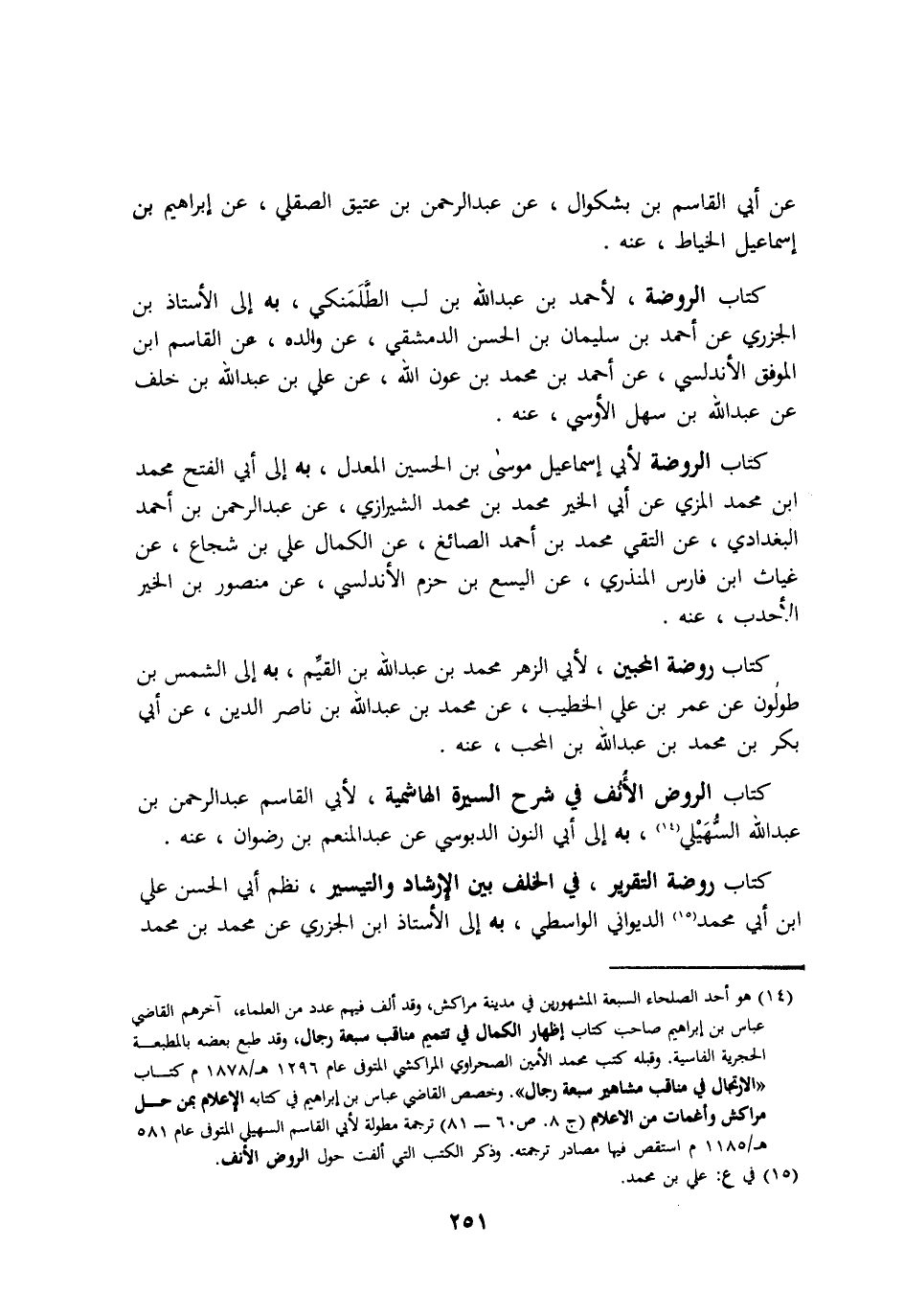 عن ابي القاسم بن بشكوال عن عبد الرحمن بن عتيق الصقلي عن ابراهيم بن اسماعيل الخياط عنه. كتاب الروضة لأحمد بن عبد الله بن لب الطلمنكي به الي الأستاذ بن الجزري عن احمد بن سليمان بن الحسن الدمشقي عن والده عن القاسم ابن الموفق الأندلسي عن احمد بن محمد بن عون الله عن علي بن عبد الله بن خلف عن عبد الله بن سهل الأوسي عنه. كتاب الروضة لأبي اسماعيل موسي بن الحسين المعدل به الي ابي الفتح محمد ابن محمد المزي عن ابي الخير محمد بن محمد الشيرازي عن عبد الرحمن بن احمد البغدادي عن التقي محمد بن احمد الصائغ عن الكمال علي بن شجاع عن غياث ابن فارس المنزري عن اليسع بن حزم الأندلسي عن منصور بن الخير الأحدب عنه. كتاب روضة المحبين لأبي الزهر محمد بن عبد الله بن القيم به الي الشمس بن طولون عن عمر بن علي الخطيب عن محمد بن عبد الله بن ناصر الدين عن ابي بكر بن محمد بن عبد الله بن المحب عنه. كتاب الروض الأنف في شرح السيرة الهاشمية لأبي القاسم عبد الرحمن بن عبد الله السهيلي به الي ابي النون الدبوسي عن عبد المنعم بن رضوان عنه. كتاب روضة التقريرفي الخلف بين الارشاد والتيسير نظم ابي الحسن علي ابن ابي محمد الديواني الواسطي به الي الأستاذ ابن الجزري عن محمد بن محمد