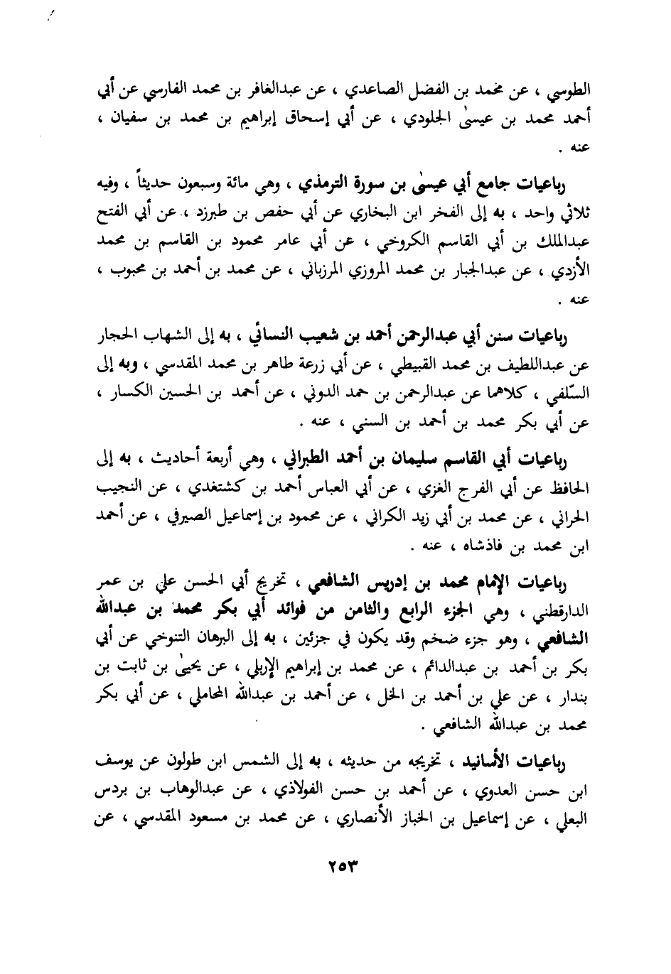 الطوسي عن محمد بن الفضل الصاعدي عن عبد الغافر بن محمد الفارسي عن ابي احمد محمد بن عيسي الجلودي عن ابي اسحاق ابراهيم بن محمد بن سفيان عنه. رباعيات جامع ابي عيسي بن سورة الترمذي وهي مائة وسبعون حديثا وفيه ثلاثي واحد به الي الفخر ابن البخاري عن ابي حفص بن طبرزد عن ابي الفتح عبد الملك بن ابي القاسم الكروخي عن ابي عامر محمود بن القاسم بن محمد الأزدي عن عبد الجبار بن محمد المروزي المرزباني عن محمد بن احمد بن محبوب عنه. رباعيات سنن ابي عبد الرحمن احمد بن شعيب النسائي به الي الشهاب الحجار عن عبد اللطيف بن محمد القبيطي عن ابي زرعة طاهر بن محمد المقدسي وبه الي السلفي كلاهما عن عبد الرحمن بن حمد الدوني عن احمد بن الحسين الكسار عن ابي بكر محمد بن احمد بن السني عنه. رباعيات ابي القاسم سليمان بن احمد الطبراني وهي اربعة احاديث به الي الحافظ عن ابي الفرج والغزي عن ابي العباس احمد بن كشتغدي عن النجيب الحراني عن محمد بن ابي زيد الكراني عن محمود بن اسماعيل الصيرفي عن احمد ابن محمد بن فاذشاه عنه. رباعيات الإمام محمد بن ادريس الشافعي تخريج ابي الحسن علي بن عمر الدارقطني وهي الجزء الرابع والثامن من فوائد ابي بكر محمد بن عبد الله الشافعي وهي الجزء الرابع والثامن من فوائد ابي بكر محمد بن عبد الله الشافعي وهو جزء ضخم وقد يكون في جزئين به الي البرهان التنوخي عن ابي بكر بن احمد بن عبد الدائم عن محمد بن ابراهيم الإريلي عن يحيي بن ثابت بن بندار عن علي بن احمد بن الخل عن احمد بن عبد الله المحاملي عن ابي بكر محمد بن عبد الله الشافعي. رباعيات الأسانيد تخريجه من حديثه به الي الشمس ابن طولون عن يوسف ابن حسن العدوي عن احمد بن حسن الفولاذي عن عبد الوهاب بن بردس البعلي عن اسماعيل بن الخباز الأنصاري عن محمد بن مسعود المقدسي عن