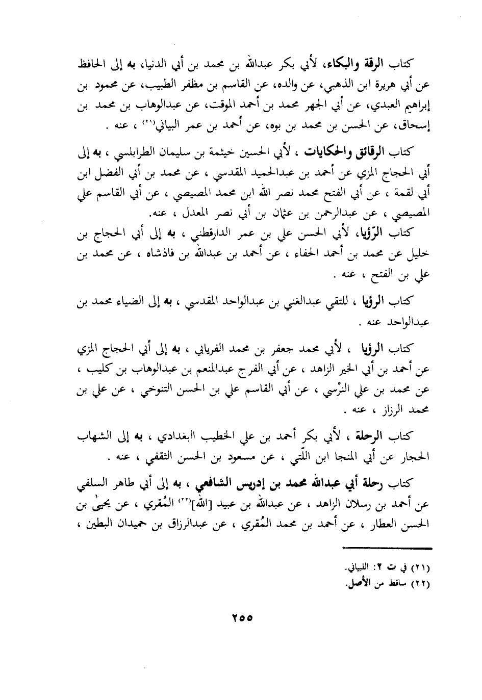 كتاب الرقة والبكاء لأبي بكر عبد الله بن محمد بن ابي الدنيا به الي الحافظ عن ابي هريرة ابن الذهبي عن والده عن القاسم بن مظفر الطبيب عن محمود بن ابراهيم العبدي عن ابي الجهر محمد بن احمد الموقت عن عبد الوهاب بن محمد بن اسحاق عن الحسن بن محمد بن بوه عن احمد بن عمر البياني عنه. كتاب الرقائق والحكايات لأبي الحسين خيثمة بن سليمان الطرابلسي به الي ابي الحجاج المزي عن احمد بن عبد الحميد المقدسي عن محمد بن ابي الفضل ابن ابي لقمة عن ابي الفتح محمد نصر الله ابن محمد المصيصي عن ابي القاسم علي المصيصي عن عبد الرحمن بن عثمان بن ابي نصر المعدل عنه. كتاب الرؤيا لأبي الحسن علي بن عمر الدارقطني به الي ابي الحجاج بن خليل عن محمد بن احمد الحفاء عن احمد بن عبد الله بن فاذشاه عن محمد بن علي بن الفتح عنه. كتاب الرؤيا للتقي عبد الغني بن عبد الواحد المقدسي به الي الضياء محمد بن عبد الواحد عنه. كتاب الرؤيا لأبي محمد جعفر بن محمد الفرياني به الي ابي الحجاج المزي عن احمد بن ابي الخير الزاهد عن ابي الفرج عبد المنعم بن عبد الوهاب بن كليب عن محمد بن علي النرسي عن ابي القاسم علي بن الحسن التنوخي عن علي بن محمد الرزاز عنه. كتاب الرحلة لأبي بكر احمد بن علي الخطيب البغدادي به الي الشهاب الحجار عن ابي المنجا ابن اللتي عن مسعود بن الحسن الثقفي عنه. كتاب رحلة ابي عبد الله محمد بن ادريس الشافعي به الي ابي طاهر السلفي عن احمد بن رسلان الزاهد عن عبد الله بن عبيد الله المقري عن يحيي بن الحسن العطار عن احمد بن محمد المقري عن عبد الرزاق بن حميدان البطين؛