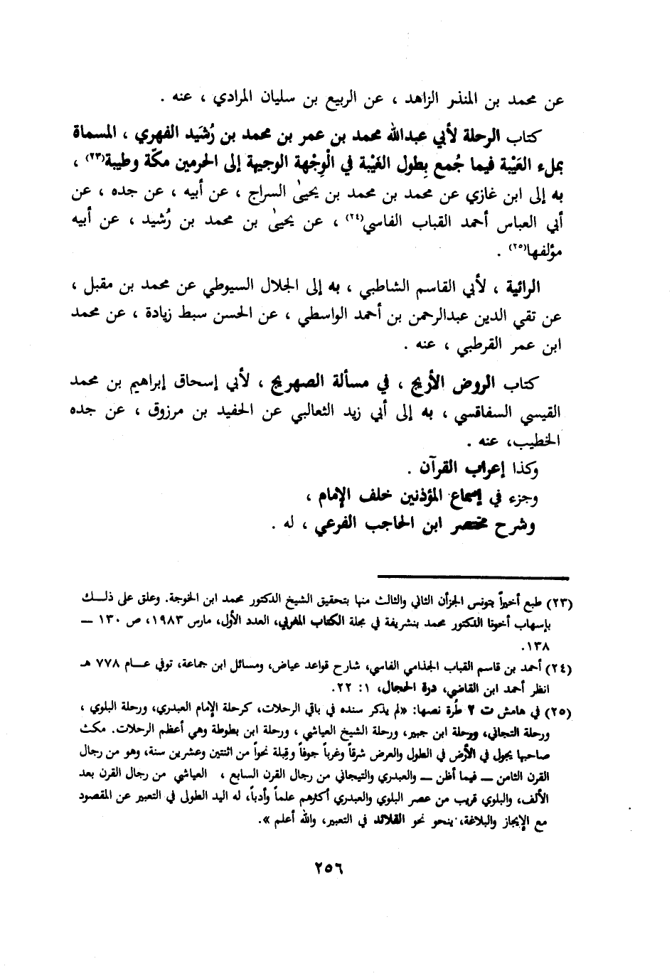 عن محمد بن المنذر الزاهد عن الربيع بن سليان المرادي عنه كتاب الرحلة لأبي عبد الله بن عمر بن محمد بن رشيد الفهري المسماة بملء العيبة فيما جمع بطول الغيبة في الوجهة الوجيهة الي الحرمين مكة وطيبة به الي ابن غازي عن محمد بن محمد بن يحيي السراج عن ابيه عن جده عن ابي العباس احمد القباب الفاسي عن يحيي بن محمد بن رشيد عن ابيه مؤلفها. الرائية لأبي القاسم الشاطبي به الي الجلال السيوطي عن محمد بن مقبل عن تقي الدين عبد الرحمن احمد الواسطي عن الحسن سبط زيادة عن محمد ابن عمر القرطبي عنه كتاب الروض الأريج في مسألة الصهريج لأبي اسحاق ابراهيم بن محمد القيسي السفاقسي به الي زيد الثعالبي عن الحفيد بن مرزوق عن جده الخطيب عنه وكذا اعراب القرآن وجزء في اسماع المؤذنين خلف الإمام. وشرح مختصر ابن الحاجب الفرعي له.