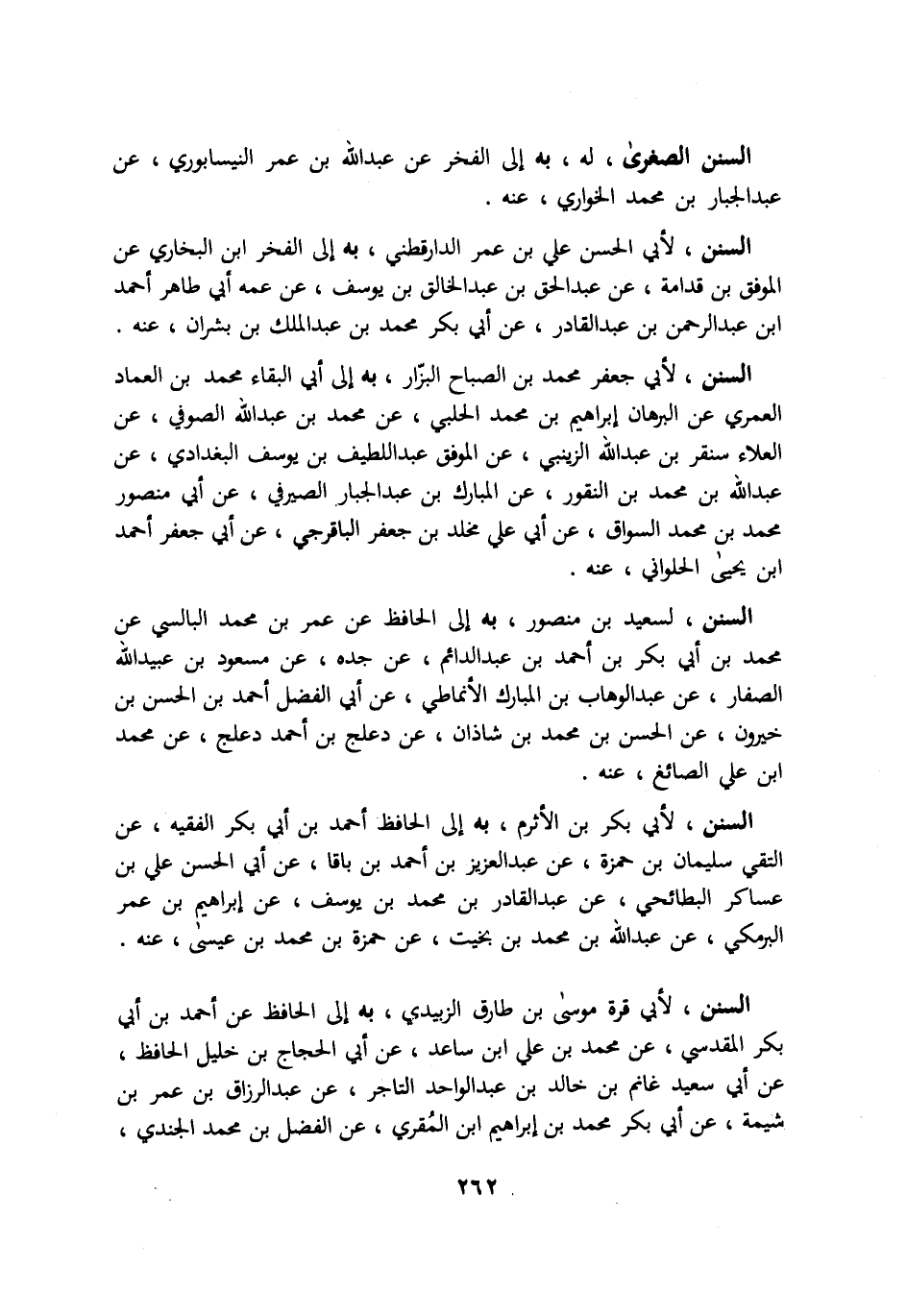 السنن الصغري له به الي الفخر عن عبد الله بن عمر النيسابوري عن عبد الجبار بن محمد الخواري عنه السنن لأبي الحسن علي بن عمر الدارقطني به الي الفخر ابن البخاري عن الموفق بن قدامة عن عبد الحق بن عبد الخالق بن يوسف عن عمه ابي طاهر احمد ابن عبد الرحمن بن عبد القادر عن ابي بكر محمد بن عبد الملك بن بشران عنه السنن لأبي جعفر محمد بن الصباح البزار به الي ابي البقاء محمد بن العماد العمري عن البرهان ابراهيم بن محمد الحلبي عن محمد بن عبد الله الصوفي عن العلاء سنقر بن عبد الله الزينبي عن الموفق عبد اللطيف بن يوسف البغدادي عن عبد الله بن محمد بن النقور عن المبارك بن عبد الجبار الصيرفي عن ابي منصور محمد بن محمد السواق عن ابي علي مخلد بن جعفر الباقرجي عن ابي جعفر احمد ابن يحيي الحلواني عنه. السنن لسعيد بن منصور به الي الحافظ عن عمر بن محمد البالسي عن محمد بن ابي بكر بن احمد بن عبد الدائم عن جده عن مسعود بن عبيد الله الصفار عن عبد الوهاب بن المبارك الأنماطي عن ابي الفضل احمد بن الحسن بن خيرون عن الحسن بن محمد بن شاذان عن دعلج بن احمد دعلج عن محمد ابن علي الصائغ عنه. السنن لأبي بكر بن الأثرم به الي الحافظ احمد بن ابي بكر الفقيه عن التقي سليمان بن حمزة عن عبد العزيز بن احمد بن باقا عن ابي الحسن علي بن عساكر البطائحي عن عبد القادر بن محمد بن يوسف عن ابراهيم بن عمر البرمكي عن عبد الله بن محمد بن بخيت عن حمزة بن محمد بن عيسي عنه السنن لأبي قرة موسي بن طارق الزبيدي به الي الحافظ عن احمد بن ابي بكر المقدسي عن محمد بن علي ابن ساعد عن ابي الحجاج بن خليل الحافظ عن ابي سعيد غانم بن خالد بن عبد الواحد التاجر عن عبد الرزاق بن عمر بن شيمة عن ابي بكر بن ابراهيم ابن المقري عن الفضل بن محمد الجندي.