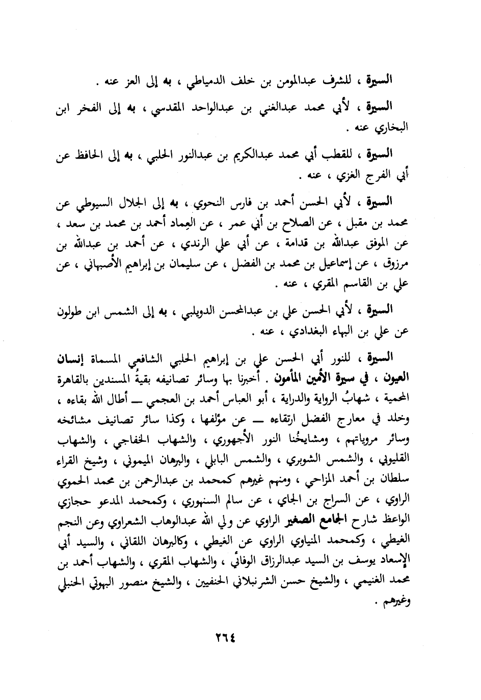 السيرة للشرف عبد المؤمن بن خلف الدمياطي به الي العز عنه السيرة لأبي محمد عبد الغني بن عبد الواحد المقدسي به الي الفخر ابن البخاري عنه. السيرة للقطب ابي محمد عبد الكريم بن عبد النور الحلبي به الي الحافظ عن ابي الفرج الغزي عنه. السيرة لأبي الحسن احمد بن فارس النحوي به الي الجلال السيوطي عن محمد بن مقبل عن الصلاح بن ابي عمر عن العماد احمد بن محمد بن سعد عن الموفق عبد الله بن قدامة عن ابي علي الرندي عن احمد بن عبد الله بن مرزوق عن اسماعيل بن محمد بن الفضل عن سليمان بن ابراهيم الأصبهاني عن علي بن القاسم المقري عنه. السيرة لأبي الحسن علي بن عبد المحسن الدويلبي به الي الشمس ابن طولون عن علي بن البهاء البغدادي عنه. السيرة للنور ابي الحسن علي بن ابراهيم الحلبي الشافعي المسماة انسان العيون في سيرة الأمين والمأمون اخبرنا بها وسائر تصانيفه بقية المسندين بالقاهرة المحمية شهاب الرواية والدارية ابو العباس احمد بن العجمي – اطال الله بقاءه وخلد في معارج الفضل ارتقاءه – عن مؤلفها وكذا سائر تصانيف مشائخه وسائر مروياتهم ومشايخنا النور الأجهوري والشهاب الخفاجي والشهاب القليوبي والشمس الشوبري والشمس البابلي والبرهان الميموني وشيخ القراء سلطان بن احمد المزاحي ومنهم غيرهم كمحمد بن عبد الرحمن بن محمد الحموي الراوي عن السراج بن الجاي عن سالم السنهوري وكمحمد المدعو حجازي الواعظ شارح الجامع الصغير الراوي عن ولي الله عبد الوهاب الشعرواي وعن النجم الغيطي وكمحمد المنياوي الرواي عن الغيطي كالبرهان اللقاني والسيد ابي الاسعاد يوسف بن السيد عبد الرزاق الوفائي والشهاب المقري والشهاب احمد بن محمد الغنيمي والشيخ حسن الشرنبلاني الحنفيين والشيخ منصور البهوتي الحنبلي وغيرهم.