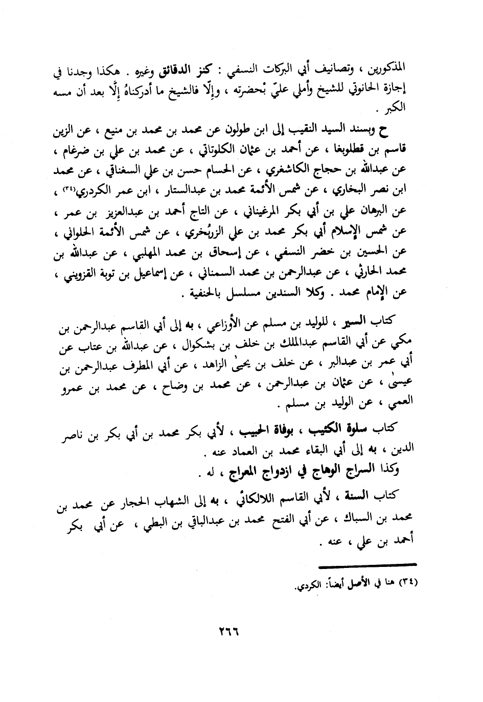 المذكورين وتصانيف ابي البركات النسفي كنز الداقائق وغيره هكذا وجدنا في اجازة الحانوتي للشيخ واملي علي بحضرته والا فالشيخ ما داركناه الا بعد ان مسه الكبر ح وبسند السيد النقيب الي بن طولون عن محمد بن محمد بن منيع عن الزين قاسم بن قطلوبغا عن احمد بن عثمان الكلوتاتي عن محمد بن علي بن ضرغام عن عبد عبد الله بن حجاج الكاشغري عن الحسام حسن بن علي السغناقي عن محمد ابن نصر البخاري عن شمس الأئمة محمد بن عبد الستار ابن عمر الكردري عن البرهان علي بن ابي بكر المرغيناني عن التاج احمد بن عبد العزيز بن عمر عن شمس الاسلام ابي بكر محمد بن علي الزربخري عن شمس الأئمة الحلواني عن الحسين بن خضر النسفي عن اسحاق بن محمد المهلبي عن عبد الله بن محمد الجارثي عن عبد الرحمن بن محمد السمناني عن اسماعيل بن توبة القزويني عن الامام محمد وكلا السندين مسلسل بالحنفية. كتاب السير للوليد بن مسلم عن الاوزاعي به الي ابي القاسم عبد الرحمن بن مكي عن ابي القاسم عبد الملك بن خلف بن بشكوال عن عبد الله بن عتاب عن ابي عمر بن عبد البرعن خلف بن يحيي الزاهد عن ابي المطرف عبد الرحمن بن عيسي عن عثمان بن عبد الرحمن عن محمد بن وضاح عن محمد بن عمرو العمي عن الوليد بن مسلم. كتاب سلوة الكئيب بوفاة الحبيب لأبي بكر محمد بن ابي بكر بن ناصر الدين به الي ابي البقاء محمد بن العماد عنه. وكذا السراج الوهاج في ازدواج المعراج له. كتاب الشسنة لأبي القاسم اللالكائي به الي الشهاب الحجار عن محمد بن محمد بن السباك عن ابي الفتح محمد بن عبد الباقي بن البطي عن ابي بكر احمد بن علي عنه.