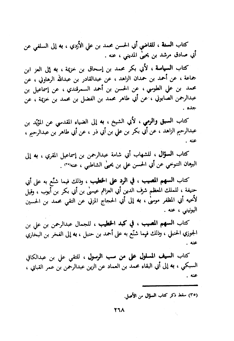 كتاب السنة للقاضي ابي الحسن محمد بن علي الأزدي به الي السلفي عن ابي صادق مرشد بن يحيي المديني عنه. كتاب السياسة لأبي بكر محمد بن اسحاق بن خزيمة به الي العز ابن جماعة عن احمد بن حمدان الزاهد عن عبد القادر بن عبد الله الروهاني عن محمد بن علي الطوسي عن الحسن بن احمد السمرقندي عن اسماعيل بن عبد الرحمن الصابوني عن ابي طاهر محمد بن الفضل بن محمد بن خزيمة عن جده. كتاب السبق والرمي لأبي الشيخ به الي الضياء المقدسي عن المؤيد بن عبد الرحمن الزاهد عن ابي بكر بن علي بن ابي ذر عن طاهر بن عبد الرحيم عنه. كتاب السؤال للشهاب ابي شامة عبد الرحمن بن اسماعيل المقري به الي البرهان التنوخي عن ابي الحسن علي بن يحيي الشاطبي عنه. كتاب السهم المصيب في الرد علي الخطيب وذلك فيما شنع به علي ابي حنيفة للملك المعظم شرف الدين ابي العزائم عيسي بن ابي بكر بن ايوب وقيل لأخيه ابي المظفر موسي به الي ابي الحجاج المزني عن التقي محمد بن الحسين اليونيني عنه. كتاب السهم المصيب في كبد الخطيب للجمال عبد الرحمن بن علي بن الجوزي الحنبلي وذلك فيما شنع به علي احمد بن حنبل به الي الفخر بن البخاري عنه. كتاب السيف المسلول علي من سب الرسول للتقي علي بن عبد الكافي السبكي به الي ابي البقاء محمد بن العماد عن الزين عبد الرحمن بن عمر القباني عنه.