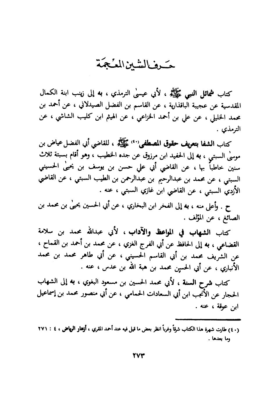 كتاب شمائل النبي صلي الله عليه وسلم لأبي عيسي الترمذي به الي زينب ابنة الكمال المقدسية عن عجيبة الباقذارية عن القاسم بن الفضل الصيدلاني عن احمد بن محمد الخليلي عن علي بن احمد الخزاعي عن الهيثم ابن كليب الشاشي عن الترمذي. كتاب الشفا بتعريف حقوق المصطفي صلي الله عليه وسلم للقاضي ابي الفضل عياض بن موسي السبتي به الي الحفيد ابن مرزوق عن جده الخطيب وهو اقام بسبته ثلاث سنين خاطبا بها عن القاضي ابي علي حس بن يوسف بن يحيي الحسيني السبتي عن محمد بن عبد الرحيم بن عبد الرحمن بن الطيب السبتي عن القاضي الأزدي السبتي عن القاضي ابن غازي السبتي عنه. ح. واعلي منه به الي الفخر ابن البخاري عن ابي الحسين يحيي بن محمد بن الصائغ عن المؤلف. كتاب الشهاب في المواعظ والآداب لأبي عبد الله محمد بن سلامة القضاعي به الي الحافظ عن ابي الفرج الغزي عن محمد بن احمد بن القماح عن الشريف محمد بن ابي القاسم الحسيني عن ابي طاهر محمد بن محمد الأنباري عن ابي الحسين محمد بن هبة الله بن عدس عنه. كتاب شرح السنة لأبي محمد الحسين بن مسعود البغوي به الي الشهاب الحجار عن الأنجب ابن ابي السعادات الحمامي عن ابي منصور محمد بن اسماعيل ابن عوقة عنه.