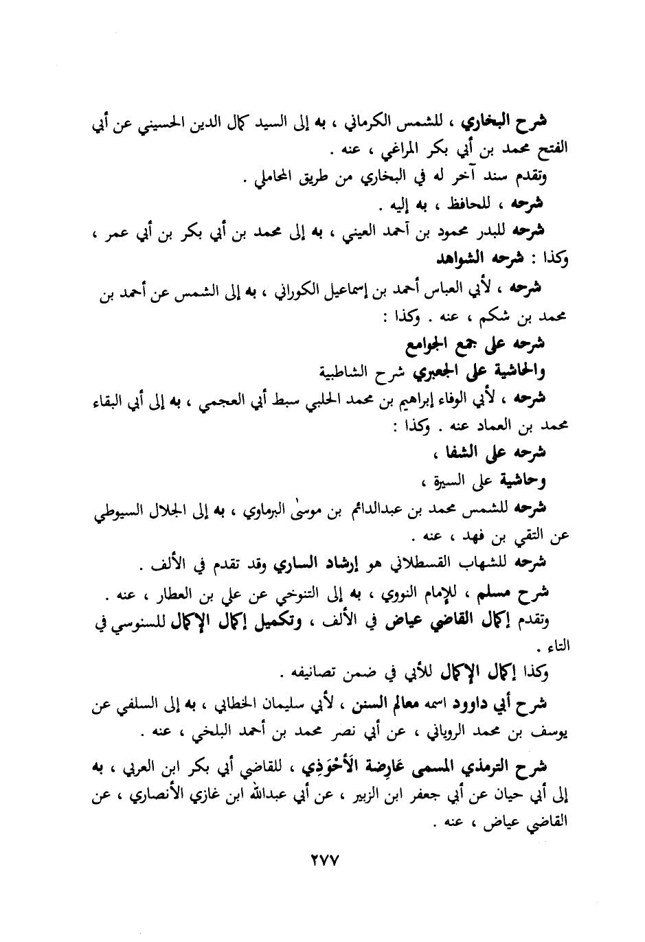 شرح البخاري للشمس الكرماني به الي السيد كمال الدين الحسيني عن ابي الفتح محمد بن ابي بكر المراغي عنه. وتقدم سند اخر له في البخاري من طريق المحاملي. شرحه للحافظ به اليه. شرحه للبدر محمود بن احمد العيني به الي محمد بن ابي بكر بن ابي عمر وكذا شرحه الشواهد. شرحه لأبي العباس احمد بن اسماعيل الكوراني به الي الشمس عن احمد بن محمد بن شكم عنه وكذا: شرحه علي جمع الجوامع والحاشية علي الجعبري شرح الشاطبية. شرحه لأبي الوفاء ابراهيم بن محمد الحلبي سبط ابي العجمي به الي ابي البقاء محمد بن العماد عنه وكذا: شرحه علي الشفا وحاشية علي السيرة وشرحه للشمس محمد بن عبد الدائم بن موسي البرماوي به الي الجلال السيوطي عن التقي بن فهد عنه. شرحه للشهاب القسطلاني هو ارشاد الساري وقد تقدم في الألف. شرح مسلم للإمام النووي به الي التنوخي عن علي بن العطار عنه وتقدم اكمال القاضي عياض في الألف وتكميل إكمال الإكمال للسنوسي في التاء. وكذا اكمال الإكمال للأبي في ضمن تصانيفه. شرح ابي داوود اسمه معالم السنن لأبي سليمان الخطابي به الي السلفي عن يوسف بن محمد الروياني عن ابي نصر محمد بن احمد البلخي عنه. شرح الترمذي المسمي عارضة الأحوذي للقاضي ابي بكر ابن العربي به الي ابي حيان عن ابي جعفر ابن الزبير عن ابي عبد الله ابن غازي الأنصاري عن القاضي عياض عنه.