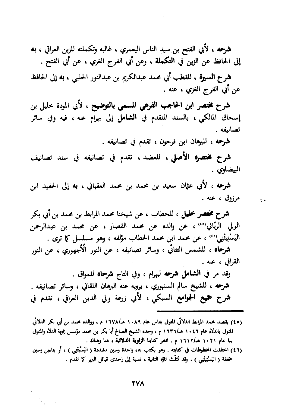 شرحه لأبي الفتح بن سيد الناس اليعمري غالبه وتكملته للزين العراقي به الي الحافظ عن الزين في التكملة وعن ابي الفرج الغزي عن ابي الفتح. شرح السيرة للقطب ابي محمد عبد الكريم بن عبد النور الحلبي به الي الحافظ عن ابي الفرج الغزي عنه. شرح مختصر ابن الحاجب الفرعي المسمي بالتوضيح لأبي المودة خليل بن اسحاق المالكي بالسند المتقدم في الشامل الي بهرام عنه فيه وفي سائر تصانيفه. شرحه للبرهان ابن فرحون تقدم في تصانيفه شرح مختصره الأصلي للعضد تقدم في تصانيفه في سند تصانيف البيضاوي. شرحه لأبي عثمان سعيد بن محمد بن محمد العقباني به الي الحفيد ابن مرزوق عنه. شرح مختصر خليل للحطاب عن شيخنا محمد المرابط بن محمد بن ابي بكر الولي الرباني عن والده عن محمد القصار عن محمد بن عبد الرحمن اليستيثني عن محمد ابن محمد الحطاب مؤلفه وهو مسلسل كما تري. شرحاه للشمس التتائي وسائر تصانيفه عن النور الأجهوري عن النور القرافي عنه. وقد مر في الشامل شرحه لبهرام وفي التاج شرحاه للمواق. شرحه للشيخ سالم السنهوري يرويه عنه البرهان اللقاني وسائر تصانيفه شرح جميع الجوامع السبكي لأبي زرعه ولي الدين العراقي تقدم في
