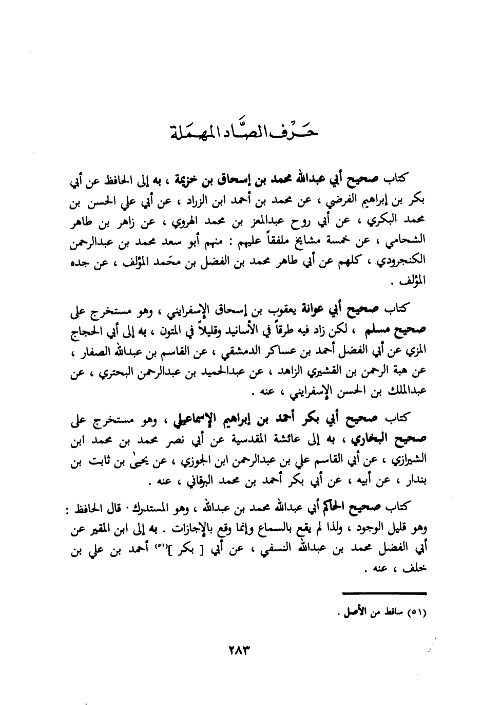 كتاب صحيح ابي عبد الله محمد بن اسحاق بن خزيمة به الي الحافظ عن ابي بكر بن ابراهيم الفرضي عن محمد بن احمد ابن الزراد عن ابي علي الحسن بن محمد البكري عن ابي روح عبد المعز بن محمد الهروي عن زاهر بن طاهر الشحامي عن خمسة مشايخ ملفقا عليهم: منهم ابو سعد محمد بن عبد الرحمن الكنجرودي كلهم عن ابي طاهر محمد بن الفضل بن محمد المؤلف عن جده المؤلف. كتاب صحيح ابي عوانة يعقوب بن اسحاق الإسفرايني وهو مستخرج علي صحيح مسلم لكن زاد فيه طرقا في الأسانيد وقليلا في المتون به الي ابي الحجاج المزي عن ابي الفضل احمد بن عساكر الدمشقي عن القاسم بن عبد الله الصفار عن هبة الرحمن بن القشيري الزاهد عن عبد الحميد بن عبد الرحمن البحتري عن عبد الملك بن الحسن الأسفرايني عنه. كتاب صحيح ابي بكر احمد بن ابراهيم الإسماعيلي وهو مستخرج علي صحيح البخاري به الي عائشة المقدسية عن ابي نصر محمد بن محمد ابن الشيرازي عن ابي القاسم علي بن عبد الرحمن ابن الجوزي عن يحيي بن ثابت بن بندار عن ابيه عن ابي بكر احمد بن محمد البرقاني عنه. كتاب صحيح الحاكم ابي عبد الله محمد بن عبد الله وهو المستدرك قال الحافظ: وهو قليل الوجود ولذا لم يقع بالسماع وانما وقع بالإجازات به الي ابن المقير عن ابي الفضل محمد بن عبد الله النسفي عن ابي بكر احمد بن علي بن خلف عنه.