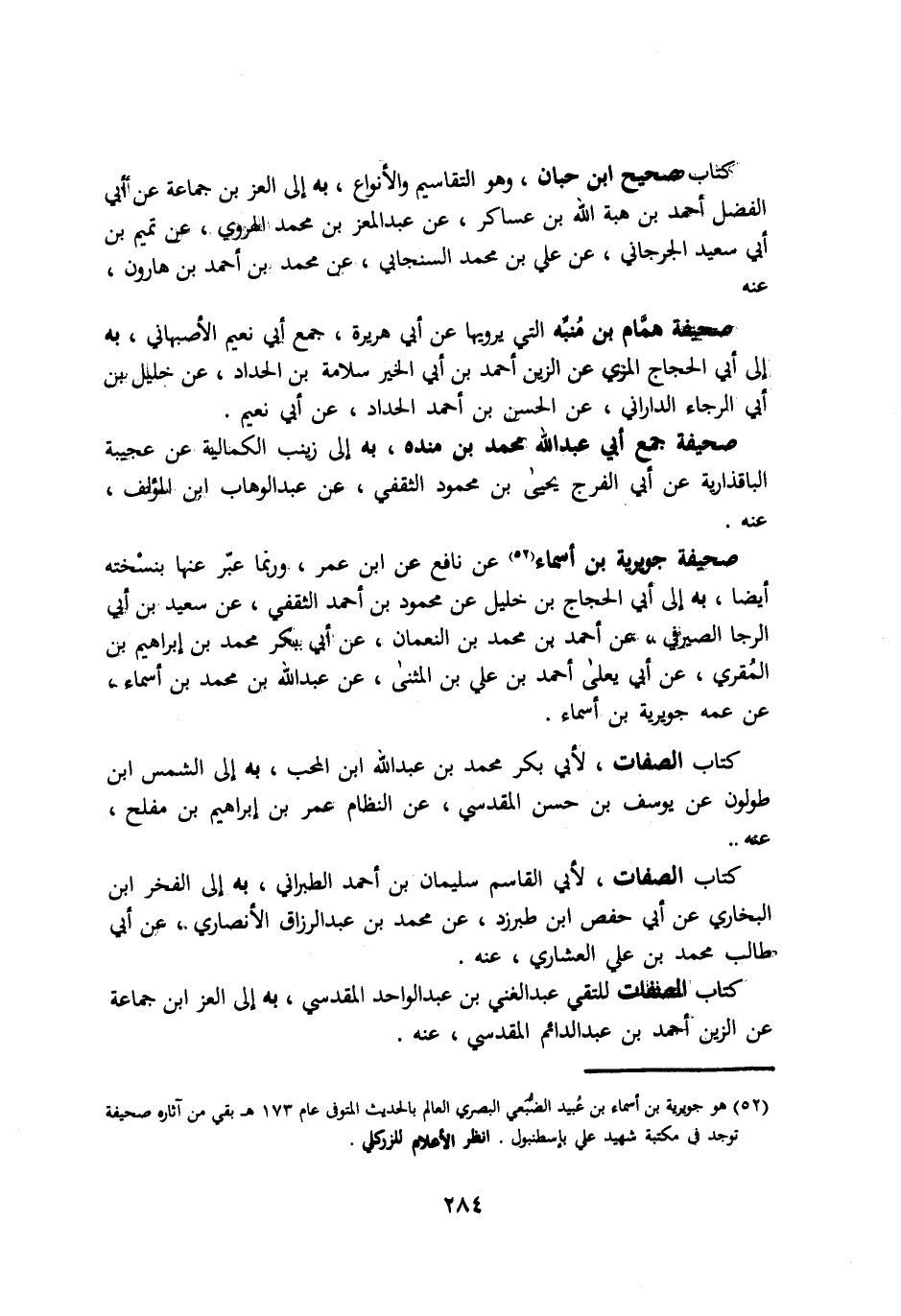 كتاب صحيح ابن حبان وهو التقاسيم والأنواع به الي العز بن جماعة عن ابي الفضل احمد بن هبة الله بن عساكر عن عبد المعز بن محمد الهروي عن تميم بن ابي سعيد الجرجاني عن علي بن محمد السنجابي عن محمد بن احمد بن هارون عنه. صحيفة همام بن منبه التي يرويها عن ابي هريرة جمع ابي نعيم الأصبهاني به الي ابي الحجاج المزي عن الزين احمد بن ابي الخير سلامة بن الحداد عن خليل بن ابي الرجاء الداراني عن الحسن بن احمد الحداد عن ابي نعيم. صحيفة جمع ابي عبد الله محمد بن منده به الي زينب الكمالية عن عجيبة الباقذارية عن ابي الفرج يحيي بن محمود الثقفي عن عبد الوهاب ابن المؤلف عنه صحيفة جويرية بن اسماء عن نافع عن ابن عمر وربما عبر عنها بنسخته ايضا به الي ابي الحجاج بن خليل عن محمود الثقفي عن سعيد بن ابي الرجا الصيرفي عن احمد بن محمد بن النعمان عن ابي بكر محمد بن ابراهيم بن المقري عن ابي يعلي احمد بن علي بن المثني عن عبد الله بن محمد بن اسماء عن عمه جويرية بن اسماء. كتاب الصفات لأبي بكر محمد بن عبد الله ابن المحب به الي الشمس ابن طولون عن يوسف بن حسن المقدسي عن النظام عمر بن ابراهيم بن مفلح عنه. كتاب الصفات لأبي القاسم سليمان بن احمد الطبراني به الي الفخر ابن البخاري عن ابي حفص ابن طبرزد عن محمد بن عبد الرزاق الأنصاري عن ابي طالب محمد بن علي العشاري عنه. كتاب المصنفات للتقي عبد الغني بن عبد الواحد المقدسي به الي العز ابن جماعة عن الزين احمد بن عبد الدائم المقدسي عنه.