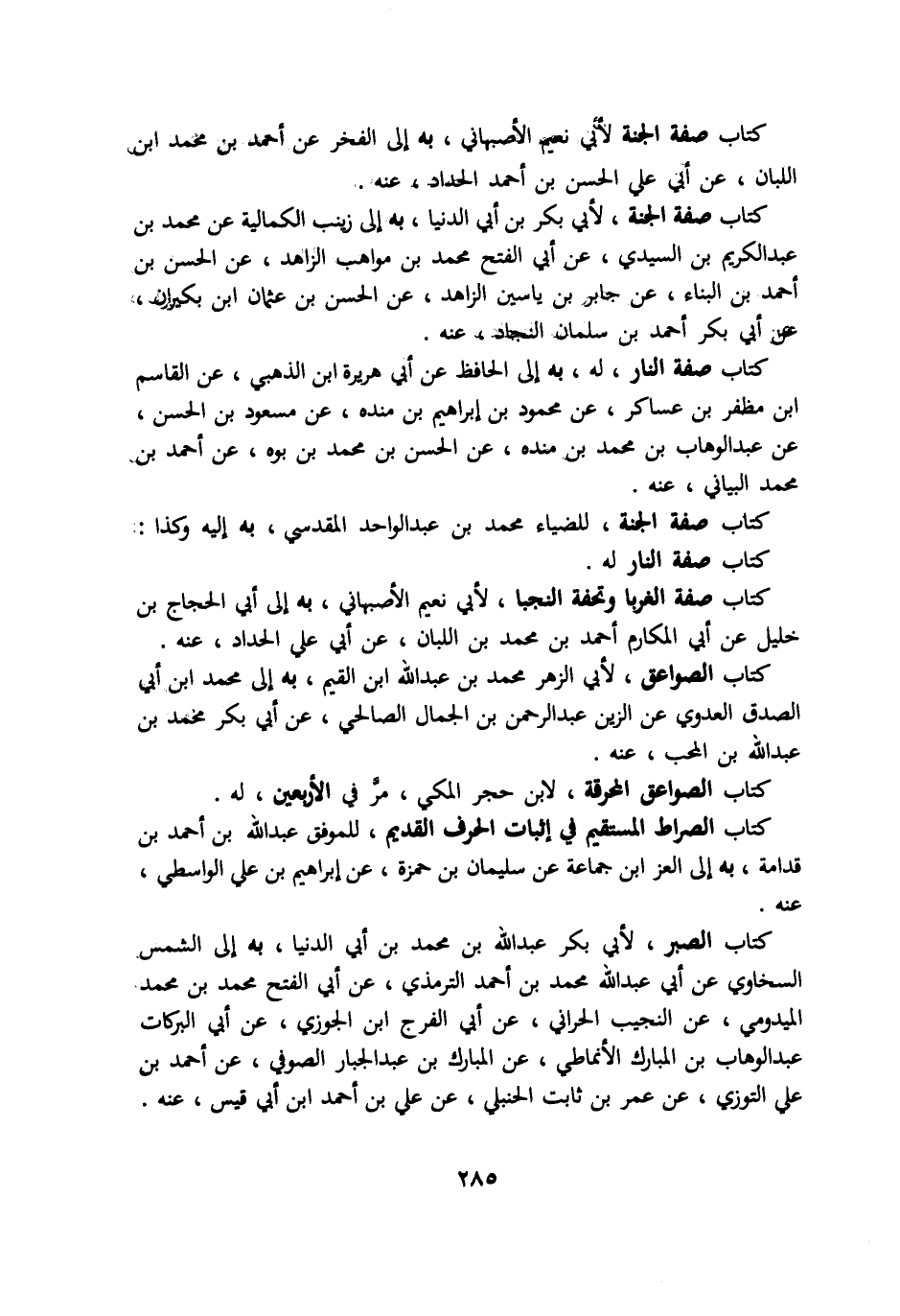 كتاب صفة الجنة لأبي نعيم الأصبهاني به الي الفخر عن احمد بن محمد ابن اللبان عن ابي علي الحسن بن احمد الحداد عنه. كتاب صفة الجنة لأبي بكر بن ابي الدنيا به الي زينب الكمالية عن محمد بن عبد الكريم بن السيدي عن ابي الفتح محمد بن مواهب الزاهد عن الحسن بن احمد بن البناء عن جابر بن ياسين الزاهد عن الحسن بن عثمان ابن بكيران عن ابي بكر احمد بن سلمان النجاد عنه. كتاب صفة النار له به الي الحافظ عن ابي هريرة ابن الذهبي عن القاسم ابن مظفر بن عساكر عن محمود بن ابراهيم بن منده عن مسعود بن الحسن عن عبد الوهاب بن محمد بن منده عن الحسن بن محمد بن بوه عن احمد بن محمد البياني عنه. كتاب صفة الجنة للضياء محمد بن عبد الواحد المقدسي به اليه وكذا: كتاب صفة النار له. كتاب صفة الغربا وتحفة النجبا لأبي نعيم الأصبهاني به الي ابي الحجاج بن خليل عن ابي المكارم احمد بن محمد بن اللبان عن ابي علي الحداد عنه كتاب الصواعق لأبي الزهر محمد بن عبد الله ابن القيم به الي محمد ابن ابي الصدق العدوي عن الزين عبد الرحمن بن الجمال الصالحي عن ابي بكر محمد بن عبد الله بن المحب عنه. كتاب الصواعق المحرقة لأبن حجر المكي مر في الأربعين له. كتاب الصراط المستقيم في اثبات الحرف القديم للموفق عبد الله بن احمد بن قدامة به الي العز ابن جماعة عن سليمان بن حمزة عن ابراهيم بن علي الواسطي عنه. كتاب الصبر لأبي بكر عبد الله بن محمد بن ابي الدنيا به الي الشمس السخاوي عن ابي عبد الله محمد بن احمد الترمذي عن ابي الفتح محمد بن محمد الميدومي عن النجيب الحراني عن ابي الفرج ابن الجوزي عن ابي البركات عبد الوهاب بن المبارك الأنماطي عن المبارك بن عبد الجبار الصوفي عن احمد بن علي التوزي عن عمر بن ثابت الحنبلي عن علي بن احمد ابن ابي قيس عنه.
