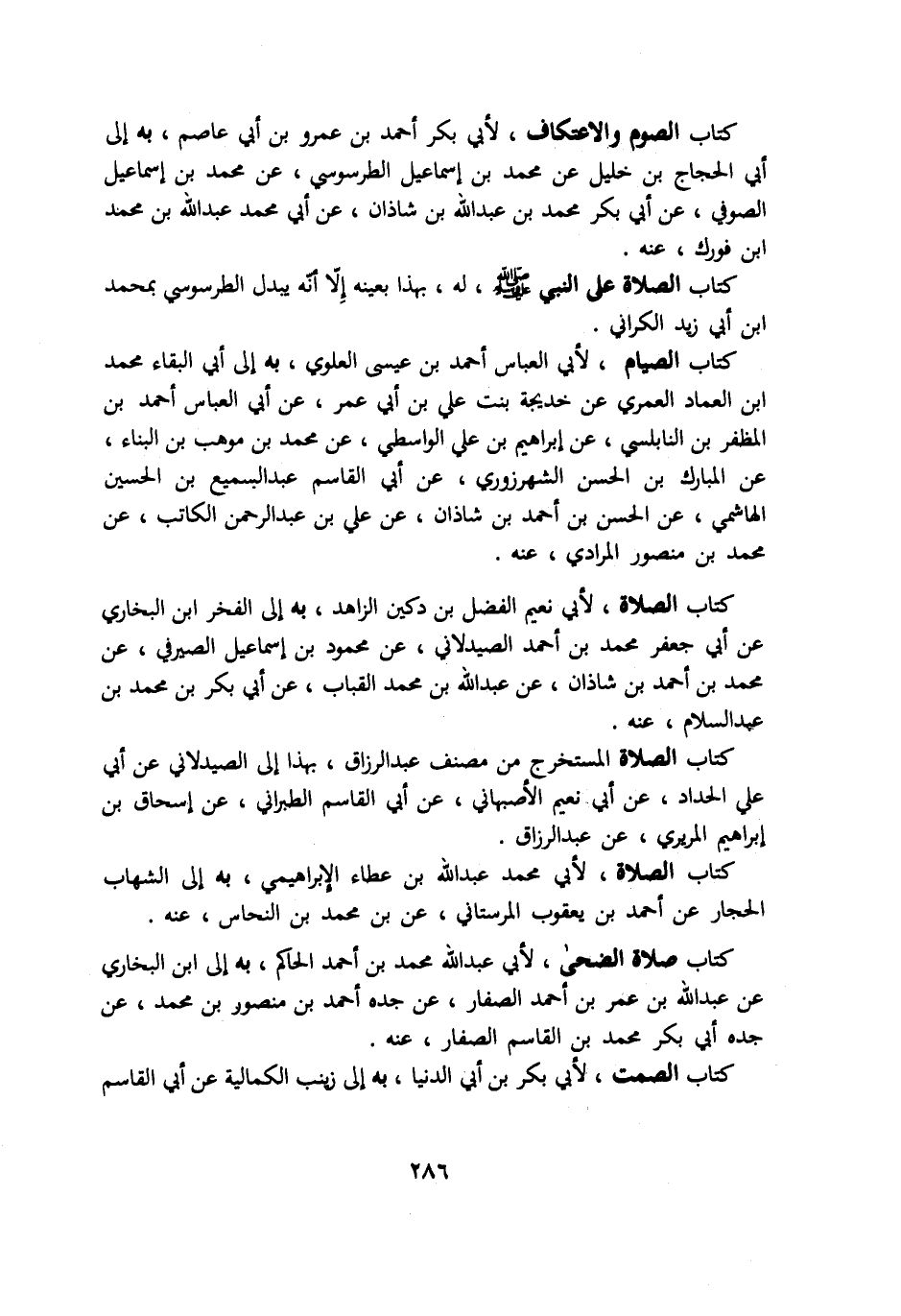 كتاب الصوم والاعتكاف لأبي بكر احمد بن عمرو بن ابي عاصم به الي ابي الحجاج بن خليل عن محمد بن اسماعيل الطرسوسي عن محمد بن اسماعيل الصوفي عن ابي بكر محمد بن عبد الله بن شاذان عن ابي محمد عبد الله بن محمد ابن فورك عنه. كتاب الصلاة علي النبي صلي الله عليه وسلم له بهذا بعينه الا انه يبدل الطرسوسي بمحمد ابن ابي زيد الكراني كتاب الصيام لأبي العباس احمد بن عيسي العلوي به الي ابي البقاء محمد ابن العماد العمري عن خديجة بنت علي بن ابي عمر عن ابي العباس احمد بن المظفر بن النابلسي عن ابراهيم بن علي الواسطي عن محمد بن موهب بن البناء عن المبارك بن الحسن بن الشهرزوري عن ابي القاسم عبد السميع بن الحسين الهاشمي عن الحسن بن احمد بن شاذان عن علي بن عبد الرحمن الكاتب عن محمد بن منصور المرادي عنه. كتاب الصلاة لأبي نعيم الفضل بن دكين الزاهد به الي الفخر ابن البخاري عن ابي جعفر محمد بن احمد الصيدلاني عن محمود بن اسماعيل الصيرفي عن محمد بن احمد بن شاذان عن عبد الله بن محمد القباب عن ابي بكر بن محمد بن عبد السلام عنه. كتاب الصلاة المستخرج من مصنف عبد الرزاق بهذا الي الصيدلاني عن ابي علي الحداد عن ابي نعيم الأصبهاني عن ابي القاسم الطبراني عن اسحاق بن ابراهيم المريري عن عبد الرزاق. كتاب الصلاة لأبي محمد عبد الله بن عطاء الإبراهيمي به الي الشهاب الحجار عن احمد بن يعقوب المرستاني عن بن محمد بن النحاس عنه. كتاب صلاة الضحي لأبي عبد الله محمد بن احمد الحاكم به الي ابن البخاري عن عبد الله بن عمر بن احمد الصفار عن جده احمد بن منصور بن محمد عن جده ابي بكر محمد بن القاسم الصفار عنه. كتاب الصمت لأبي بكر بن ابي الدنيا به الي زينب الكمالية عن ابي القاسم.