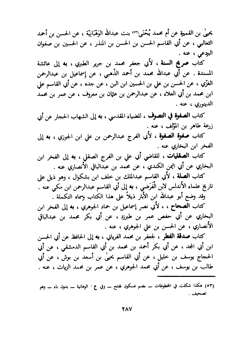 يحيي بن القميرة عن ام محمد يحني بنت عبد الله الوهبانية عن الحسن بن احمد الثعالبي عن ابي القاسم الحسن بن الحسن بن المنذر عن الحسين بن صفوان البردعي عنه. كتاب صريح السنة لأبي جعفر محمد بن جرير الطبري به الي عائشة المسندة عن ابي عبد الله محمد بن احمد الذهبي عن اسماعيل بن عبد الرحمن الغزي عن الحسن بن علي بن الحسين ابن البن عن جده عن ابي القاسم علي ابن محمد بن ابي العلاء عن عبد الرحمن بن عثمان بن معروف عن عمر بن محمد الدينوري عنه. كتاب الصفوة في التصوف للضياء المقدسي به الي الشهاب الحجار عن ابي زرعة طاهر بن المؤلف عنه. كتاب صفوة الصفوة لأبي الفرج عبد الرحمن بن علي ابن الجوزي به الي الفخر ابن البخاري عنه. كتاب الصقليات للقاضي ابي علي بن الفرج الصقلي به الي الفخر ابن البخاري عن ابي اليمن الكندي عن محمد بن عبد الباقي الأنصاري عنه. كتاب الصلة لأبي القاسم عبد الملك بن خلف ابن بشكوال وهو ذيل علي تاريخ علماء الأندلس لابن الفرضي به الي ابي القاسم عبد الرحمن ابن مكي عنه وقد وضع ابو عبد الله ابن الأبار علي هذا الكتاب وسماه التكملة كتاب الصحاح لأبي نصر اسماعيل بن حماد الجوهري به الي الفخر ابن البخاري عن ابي حفص عمر بن طبرزد عن ابي بكر محمد بن عبد الباقي الأنصاري عن الحسن بن علي الجوهري عنه كتاب صدقة الفطر لجعفر بن محمد الفريابي به الي الحافظ عن ابي الحسن ابن ابي المجد عن ابي بكر احمد بن محمد بن ابي القاسم الدمشقي عن ابي الحجاج يوسف بن خليل عن ابي القاسم يحيي بن اسعد بن بوش عن ابي طالب بن يوسف عن ابي محمد الجوهري عن عمر بن محمد الزيات عنه.