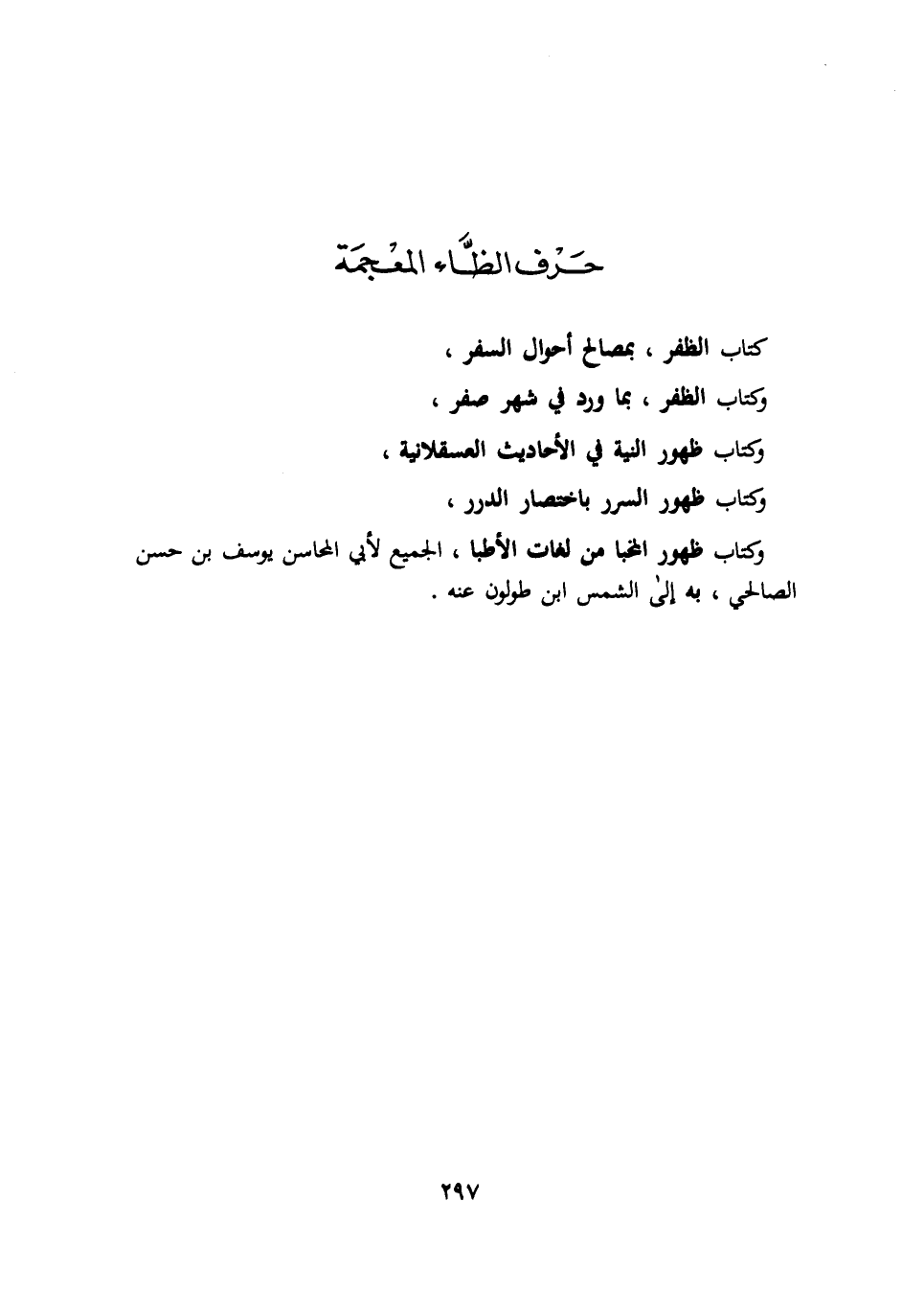 كتاب الظفر بمصالح احوال السفر وكتاب الظفر بما ورد في شهر صفر وكتاب ظهور النية في الأحاديث العسقلانية وكتاب ظهور السرر باختصار الدرر وكتاب ظهور المخبا من لغات الأطبا الجميع لأبي المحاسن يوسف بن حسن الصالحي به الي الشمس ابن طولون عنه.