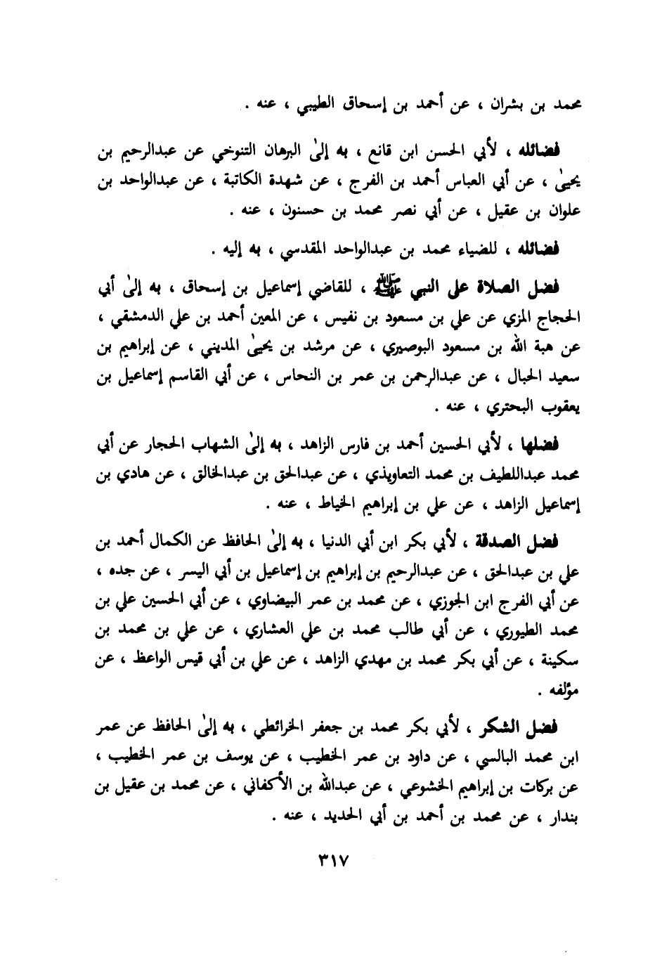 محمد بن بشران عن احمد بن اسحاق الطيبي عنه. فضائله لأبي الحسن ابن قانع به الي البرهان التنوخي عن عبد الرحيم بن يحيي عن ابي العباس احمد بن الفرج عن شهدة الكاتبة عن عبد الواحد بن علوان بن عقيل عن ابي نصر محمد بن حسنون عنه. فضائله للضياء محمد بن عبد الواحد المقدسي به اليه. فضل الصلاة علي النبي صلي الله عليه وسلم للقاضي اسماعيل بن اسحاق به الي ابي الحجاج المزي عن علي بن مسعود بن نفيس عن المعين احمد بن علي الدمشقي عن هبة الله بن مسعود البوصيري عن مرشد بن يحيي المديني عن ابراهيم بن سعيد الحبال عن عبد الرحمن بن عمر بن النحاس عن ابي القاسم اسماعيل بن يعقوب البحتري عنه. فضلها لأبي الحسين احمد بن فارس الزاهد به الي الشهاب الحجار عن ابي محمد عبد اللطيف بن محمد التعاويذي عن عبد الحق بن عبد الخالق عن هادي بن اسماعيل الزاهد عن علي بن ابراهيم الخياط عنه. فضل الصدقة لأبي بكر ابن ابي الدنيا به الي الحافظ عن الكمال احمد بن علي بن عبد الحق عن عبد الرحيم بن ابراهيم بن اسماعيل بن ابي اليسر عن جده عن ابي الفرج ابن الجوزي عن محمد بن عمر البيضاوي عن ابي الحسين علي بن محمد الطيوري عن ابي طالب محمد بن علي العشاري عن علي بن محمد بن سكينة عن ابي بكر محمد بن المهدي الزاهد عن علي بن ابي قيس الواعظ عن مؤلفه. فضل الشكر لأبي بكر محمد بن جعفر الخرائطي به الي الحافظ عن عمر ابن محمد البالسي عن داود بن عمر الخطيب عن يوسف بن عمر الخطيب عن بركات بن ابراهيم الخشوعي عن عبد الله بن الأكفاني عن محمد بن عقيل بن بندار عن محمد بن احمد بن ابي الحديد عنه.