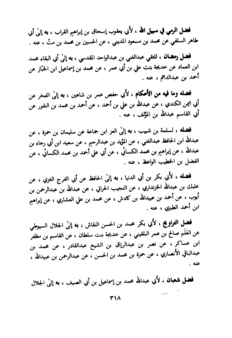 فضل الرمي في سبيل الله لأبي يعقوب اسحاق بن ابراهيم القراب به الي ابي طاهر السلفي عن محمد بن مسعود الميني عن الحسين بن محمد بن مت عنه. فضل رمضان للتقي عبد الغني بن عبد الواحد المقدسي به الي ابي البقاء محمد ابن العماد عن خديجة بنت علي بن ابي عمر عن محمد بن اسماعيل ابن الخباز عن احمد بن عبد الدائم عنه. فضله ومافيه من الأحكام لأبي حفص عمر بن شاهين به الي الفخر عن ابي اليمن الكندي عن عبد الله بن علي بن احمد عن احمد بن محمد بن النقور عن ابي القاسم عبد الله بن المؤلف عنه. فضله لسلمة بن شبيب به الي العز ابن جماعة عن سليمان بن حمزة عن عبد الله ابن الحافظ عبد الغني عن المؤيد بن عبد الرحيم عن سعيد ابن رجاء بن عبد الله عن ابراهيم بن محمد الكسائي عن ابي علي احمد بن محمد الكسائي عن الفضل بن الخطيب الواعظ عنه. فضله لأبي بكر بن ابي الدنيا به الي الحافظ عن ابي الفرج الغزي عن علبك بن عبد الله الخزنداري عن النجيب الحراني عن عبد الله بن عبد الرحمن بن ايوب عن احمد بن عبيد الله بن كادش عن محمد بن العشاري عن ابراهيم ابن احمد الطبري عنه. فضل التراويح لأبي بكر محمد بن الحسن النقاش به الي الجلال السيوطي عن العلم صالح بن عمر البلقيني عن خديجة بنت سلطان عن القاسم بن مظفر ابن عساكر عن نصر بن عبد الرزاق بن الشيخ عبد القادر عن محمد بن عبد الباقي الأنصاري عن حمزة بن محمد بن الحسن عن عبد الرحمن بن عبيد الله عنه. فضل شعبان لأبي عبد الله محمد بن اسماعيل بن ابي الصيف به الي الجلال