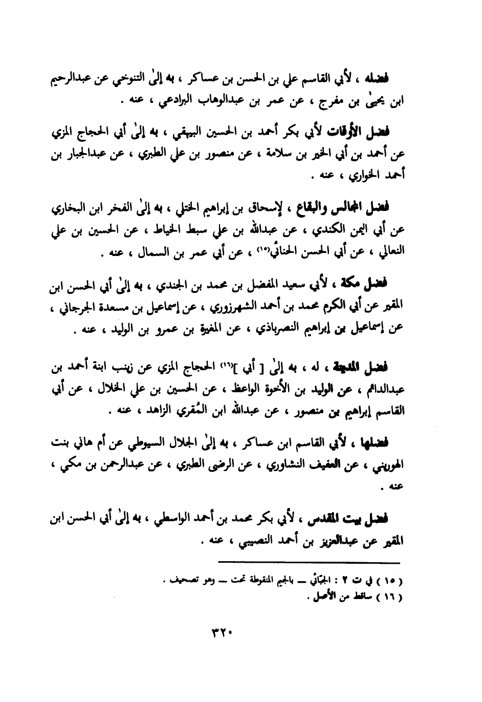 فضله لأبي القاسم علي بن الحسن بن عساكر به الي التنوخي عن عبد الرحيم ابن يحيي بن مفرج عن عمر بن عبد الوهاب البرادعي عنه. فضل الأوقات لأبي بكر احمد بن الحسين البيهقي به الي ابي الحجاج المزي عن احمد بن ابي الخير بن سلامة عن منصور بن علي الطبري عن عبد الجبار بن احمد الخواري عنه. فضل المجالس والبقاع لإسحاق بن ابراهيم الختلي به الي الفخر ابن البخاري عن ابي اليمن الكندي عن عبد الله بن علي سبط الخياط عن الحسين بن علي النعالي عن ابي الحسن الحنائي عن ابي عمر بن السمال عنه. فضل مكة لأبي سعيبد المفضل بن محمد بن الجندي به الي ابي الحسن ابن المقير عن ابي الكرم محمد بن احمد الشهرزوري عن اسماعيل بن مسعدة الجرجاني عن اسماعيل بن ابراهيم النصرباذي عن المغيرة بن عمرو بن الوليد عنه. فضل المدينة له به الي ابي الحجاج المزي عن زينب ابنة احمد بن عبد الدائم عن الوليد بن الأخوة الواعظ عن الحسين بن علي الخلال عن ابي القاسم ابراهيم بن منصور عن عبد الله ابن المقري الزاهد عنه. فضلها لأبي القاسم ابن عساكر به الي الجلال السيوطي عن ام هاني بنت الهوريني عن العفيف النشاوري عن الرضي الطبري عن عبد الرحمن بن مكي عنه. فضل بيت المقدس لأبي بكر محمد بن احمد الواسطي به الي ابي الحسن ابن المقير عن عبد العزيز بن احمد النصيبي عنه.