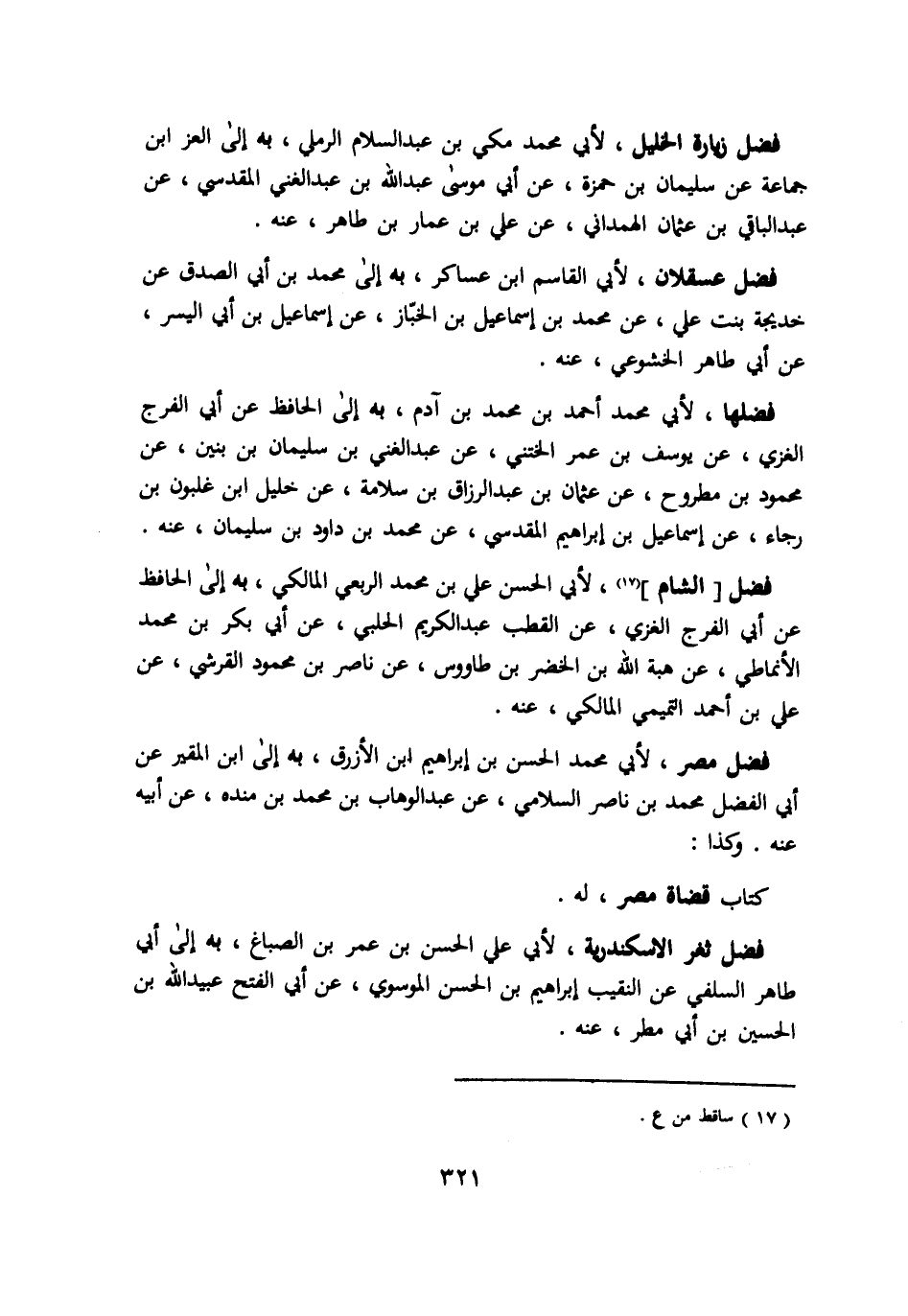 فضل زيارة الخليل لأبي محمد مكي بن عبد السلام الرملي به الي العز ابن جماعة عن سليمان بن حمزة عن ابي موسي عبد الله بن عبد الغني المقدسي عن عبد الباقي بن عثمان الهمداني عن علي بن عمار بن طاهر عنه. فضل عسقلان لأبي القاسم ابن عساكر به الي محمد بن ابي الصدق عن خديجة بنت علي عن محمد بن اسماعيل بن الخباز عن اسماعيل بن ابي اليسر عن ابي طاهر الخشوعي عنه. فضلها لأبي محمد احمد بن محمد بن ادم به الي الحافظ عن ابي الفرج الغزي عن يوسف بن عمر الختني عن عبد الغني بن سليمان بن بنين عن محمود بن مطروح عن عثمان بن عبد الرزاق بن سلامة عن خليل ابن غلبون بن رجاء عن اسماعيل بن ابراهيم المقدسي عن محمد بن داود بن سليمان عنه. فضل الشام لأبي الحسن علي بن محمد الربعي المالكي به الي الحافظ عن ابي الفرج الغزي عن القطب عبد الكريم الحلبي عن ابي بكر بن محمد الأنماطي عن هبة الله بن الخضر بن طاووس عن ناصر بن محمود القرشي عن علي بن احمد التميمي المالكي عنه. فضل مصر لأبي محمد الحسن بن ابراهيم ابن الأزرق به الي ابن المقير عن ابي الفضل محمد بن ناصر السلامي عن عبد الوهاب بن محمد بن منده عن ابيه عنه وكذا: كتاب قضاة مصر له. فضل ثغر الاسكندرية لأبي علي الحسن بن عمر بن الصباغ به الي ابي طاهر السلفي عن النقيب ابراهيم بن الحسن الموسوي عن ابي الفتح عبيد الله بن الحسين بن ابي مطر عنه.