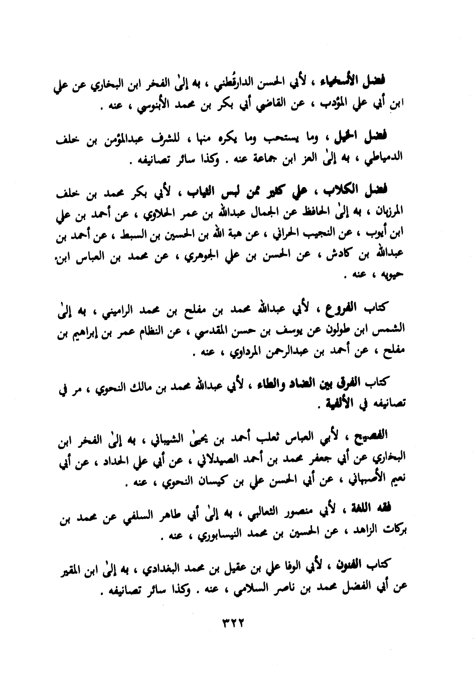 فضل الأسخياء لأبي الحسن الدارقطني به الي الفخر ابن البخاري عن علي ابن ابي علي المؤدب عن القاضي ابي بكر بن محمد الأبنوسي عنه. فضل الخيل وما يستحب وما يكره منها للشرف عبد المؤمن بن خلف الدمياطي به االي العز ابن جماعة عنه وكذا سائر تصانيفه. فضل الكلاب علي كثير ممن لبس الثياب لأبي بكر محمد بن خلف المرزبان به الي الحافظ عن الجمال عبد الله بن عمر الحلاوي عن احمد بن علي ابن ايوب عن النجيب الحراني عن هبة الله بن الحسين بن السبط عن احمد بن عبد الله بن كادش عن الحسن بن علي الجوهري عن محمد بن العباس ابن حيوية عنه. كتاب الفروع لأبي عبد الله محمد بن مفلح بن محمد الراميني به الي الشمس ابن طولون عن يوسف بن حسن المقدسي عن النظام عمر بن ابراهيم بن مفلح عن احمد بن عبد الرحمن المرداوي عنه. كتاب الفرق بين الضاد والطاء لأبي عبد الله محمد بن مالك النحوي مر في تصانيفة في الألفية. الفصيح لأبي العباس ثعلب احمد بن يحيي الشيباني به الي الفخر ابن البخاري عن ابي جعفر محمد بن احمد الصيدلاني عن ابي علي الحداد عن ابي نعيم الأصبهاني عن ابي الحسن علي بن كيسان النحوي عنه. فقه اللغة لأبي منصور الثعالبي به الي ابي طاهر السلفي عن محمد بن بركات الزاهد عن الحسين بن محمد النيسابوري عنه. كتاب الفنون لأبي الوفا علي بن عقيل بن محمد البغدادي به الي ابن المقير عن ابي الفضل محمد بن ناصر السلامي عنه وكذا سائر تصانيفه.