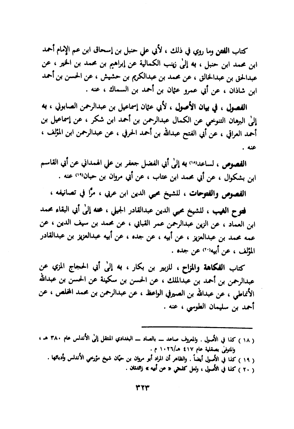 كتاب الفتن وما روي في ذلك لأبي علي حنبل بن اسحاق ابن عم الإمام احمد ابن محمد ابن حنبل به الي زينب الكمالية عن ابراهيم بن محمد بن الخير عن عبد الحق بن عبد الخالق عن محمد بن عبد الكريم بن حشيش عن الحسن بن احمد ابن شاذان عن ابي عمرو عثمان بن احمد بن السماك عنه. الفصول في بيان الأصول لأبي عثمان اسماعيل بن عبد الرحمن الصابوني به الي البرهان التنوخي عن الكمال عبد الرحمن بن احمد ابن شكر عن اسماعيل بن احمد العراقي عن ابي الفتح عبد الله بن احمد الحرفي عن عبد الرحمن ابن المؤلف عنه. الفصوص لساعد به الي ابي الفضل جعفر بن علي الهمداني عن ابي القاسم ابن بشكوال عن ابي محمد ابن عتاب عن ابي مروان بن حبان عنه الفصوص والفتوحات للشيخ محيي الدين ابن عربي مرا في تصانيفه فتوح الغيب للشيخ محيي الدين عبد القادر الجيلي عنه الي ابي البقاء محمد ابن العماد عن الزين عبد الرحمن عمر القباني عن محمد بن سيف الدين عن عمه محمد بن عبد العزيز عن ابيه عن جده عن ابيه عبد العزيز بن عبد القادر المؤلف عن ابيه عن جده كتاب الفكاهة والمزاح للزبير بن بكار به الي ابي الحجاج المزي عن عبد الرحمن بن احمد بن عبد الملك عن الحسن بن سكبنة عن الحسن بن عبد الله الأنماطي عن عبد الله بن الصيرفي الواعظ عن عبد الرحمن بن محمد المخلص عن احمد بن سليمان الطوسي عنه.