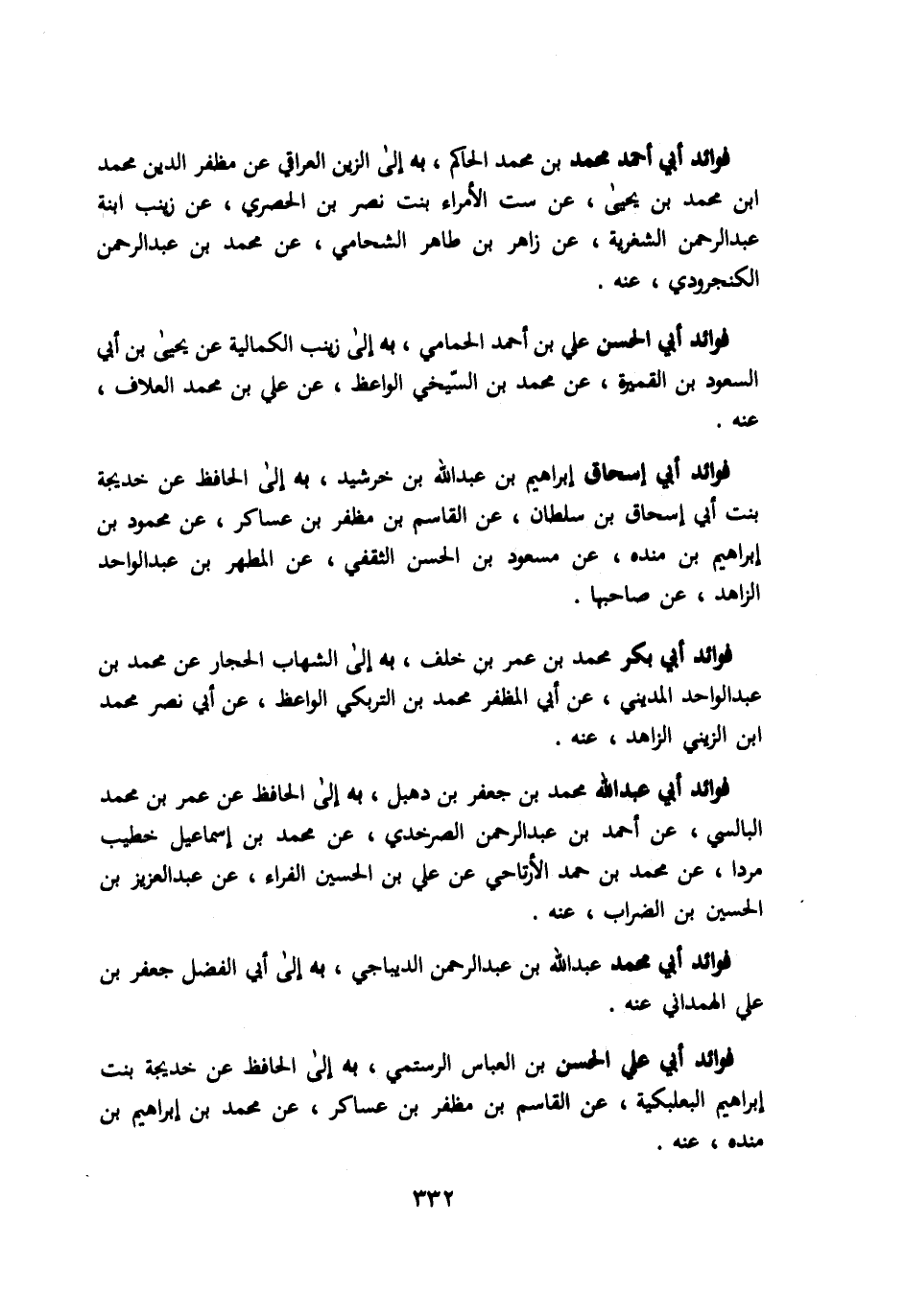 فوائد ابي احمد محمد بن محمد الحاكم به الي الزين العراقي عن مظفر الدين محمد ابن محمد بن يحيي عن ست الأمراء بنت نصر بن الحصري عن زينب ابنة عبد الرحمن الشغرية عن زاهر بن طاهر الشحامي عن محمد بن عبد الرحمن الكنجرودي عنه. فوائد ابي الحسن علي بن احمد الحمامي به الي زينب الكمالية عن يحيي بن ابي السعود بن القميرة عن محمد بن السيخي الواعظ عن علي بن محمد العلاف عنه. فوائد ابي اسحاق ابراهيم بن عبد الله بن خرشيد به الي الحافظ عن خديجة بنت ابي اسحاق بن سلطان عن القاسم بن مظفر بن عساكر عن محمود بن ابراهيم بن منده عن مسعود بن الحسن الثقفي عن المطهر بن عبد الواحد الزاهد عن صاحبها. فوائد ابي بكر محمد بن عمر بن خلف به الي الشهاب الحجار عن محمد بن عبد الواحد المديني عن ابي المظفر محمد بن التريكي الواعظ عن ابي نصر محمد ابن الزيني الزاهد عنه. فوائد ابي عبد الله محمد بن جعفر بن دهبل به الي الحافظ عن عمر بن محمد البالسي عن احمد بن عبد الرحمن الصرخدي عن محمد بن اسماعيل خطيب مردا عن محمد بن حمد الأرتاحي عن علي بن الحسين الفراء عن عبد العزيز بن الحسين بن الضراب عنه. فوائد ابي محمد عبد الله بن عبد الرحمن الديباجي به الي ابي الفضل جعفر بن علي الهمداني عنه. فوائد ابي علي الحسن بن العباس الرستمي به الي الحافظ عن خديجة بنت ابراهيم البعلبكية عن القاسم بن مظفر بن عساكر عن محمد بن ابراهيم بن منده عنه.