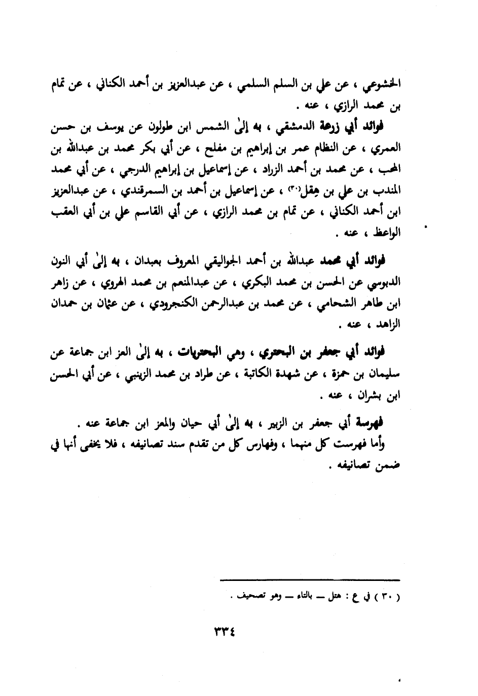 الخشوعي عن علي بن السلم السلمي عن عبد العزيز بن احمد الكناني عن تمام بن محمد الرازي عنه. فوائد ابي زرعة الدمشقي به الي الشمس ابن طولون عن يوسف بن حسن العمري عن النظام عمر بن ابراهيم بن مفلح عن ابي بكر محمد بن عبد الله بن المحب عن محمد بن احمد الزراد عن اسماعيل بن ابراهيم الدرجي عن ابي محمد المندب بن علي بن هقل عن اسماعيل بن احمد بن السمرقندي عن عبد العزيز ابن احمد الكناني عن تمام بن الرازي عن ابي القاسم علي بن ابي العقب الواعظ عنه. فوائد ابي محمد عبد الله بن احمد الجواليقي المعروف بعبدان به الي ابي النون الدبوسي عن الحسن بن محمد البكري عن عبد المنعم بن محمد الهروي عن زاهر ابن طاهر الشحامي عن محمد بن عبد الرحمن الكنجرودي عن عثمان بن حمدان الزاهد عنه. فوائد ابي جعفر بن البحتري وهي البحتريات به الي العز ابن جماعة عن سليمان بن حمزة عن شهدة الكاتبة عن طراد بن محمد الزينبي عن ابي الحسن ابن بشران عنه. فهرسة ابي جعفر بن الزبير به الي ابي حيان والمعز ابن جماعة عنه. واما فهرست كل منهما وفهارس كل من تقدم سند تصانيفه فلا يخفي انها في ضمن تصانيفه.