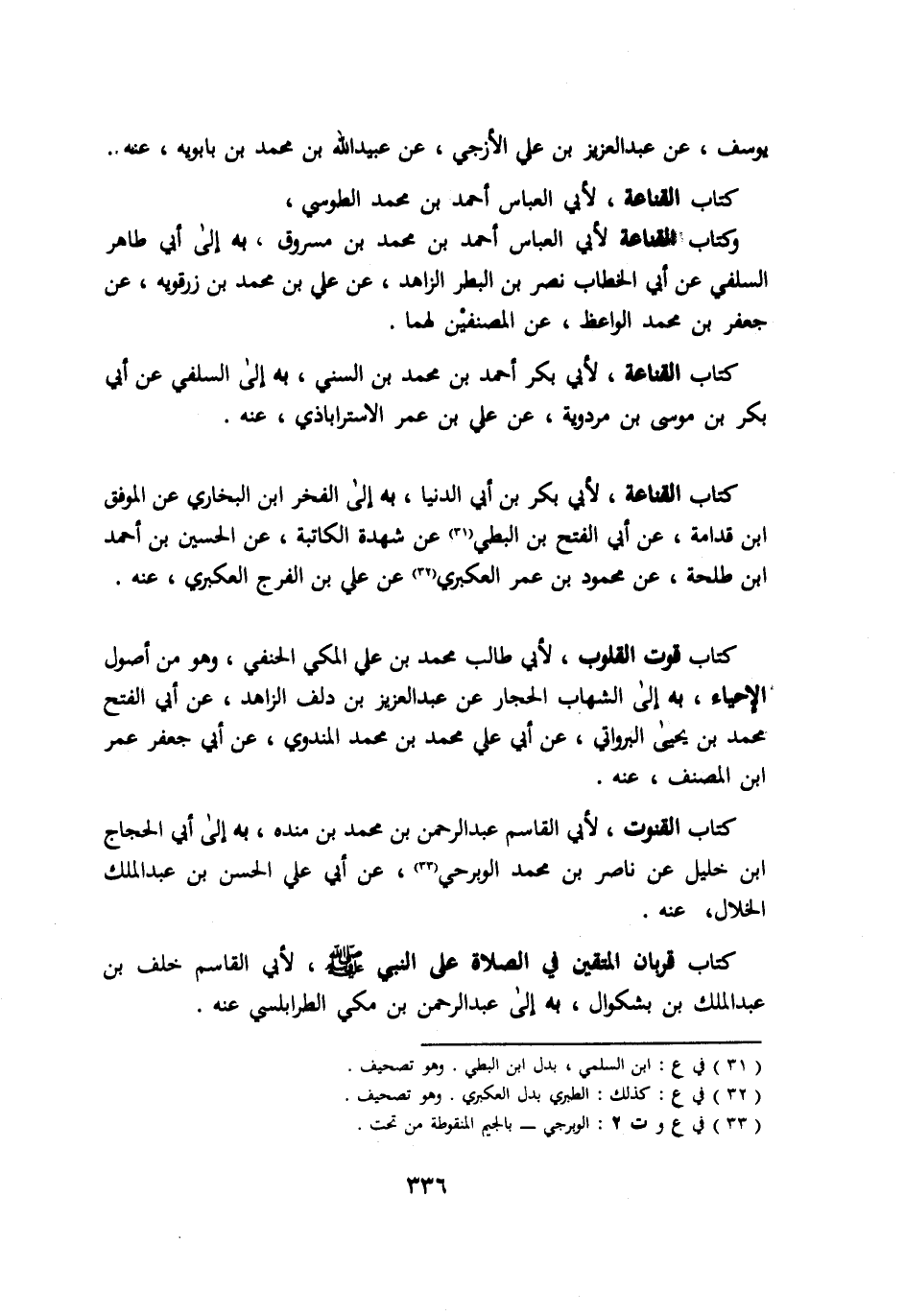 يوسف عن عبد العتزيز بن علي الأزجي عن عبيد الله بن محمد بن بابويه عنه. كتاب القناعة لأبي العباس احمد بن محمد الطوسي وكتاب القناعة لأبي العباس احمد بن محمد بن مسروق به الي ابي طاهر السلفي عن ابي الخطاب نصر بن البطر الزاهد عن علي بن محمد بن زرقوية عن جعفر بن محمد الواعظ عن المصنفين لهما. كتاب القناعة لأبي بكر احمد بن محمد بن السني به الي السلفي عن ابي بكر بن موسي بن مردوية عن علي بن عمر الاستراباذي عنه. كتاب القناعة لأبي بكر بن ابي الدنيا به الي الفخر ابن البخاري عن الموفق ابن قدامة عن ابي الفتح بن البطي عن شهدة الكاتبة عن الحسين بن احمد ابن طلحة عن محمود بن عمر العكبري عن علي بن الفرج العكبري عنه. كتاب قوت القلوب لأبي طالب محمد بن علي المكي الحنفي وهو من اصول الإحياء به الي الشهاب الحجار عن عبد العزيز بن دلف الزاهد عن ابي الفتح محمد بن يحيي البرواتي عن ابي علي محمد بن محمد المندوي عن ابي جعفر عمر ابن المصنف عنه. كتاب القنوت لأبي القاسم عبد الرحمن بن محمد بن منده به الي ابي الحجاج ابن خليل عن ناصر بن محمد الوبرحي عن ابي علي الحسن بن عبد الملك الخلال عنه. كتاب قربان المتقين في الصلاة علي النبي صلي الله عليه وسلم لأبي القاسم خلف بن عبد الملك بن بشكوال به الي عبد الرحمن بن مكي الطرابلسي عنه.
