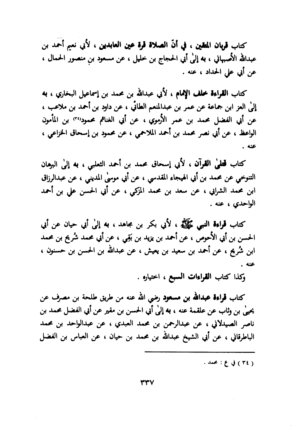 كتاب قربان المتقين في ان الصلاة قرة عين العابدين لأبي نعيم احمد بن عبد الله الأصبهاني به الي ابي الحجاج بن خليل عن مسعود بن منصور الحمال عن ابي علي الحداد عنه. كتاب القراءة خلف الإمام لأبي عبد الله بن محمد بن اسماعيل البخاري به الي العز ابن جماعة عن عمر بن عبد المنعم الطائي عن داود بن احمد بن ملاعب عن ابي الفضل محمد بن عمر الأرموي عن ابي الغنائم محمود بن المأمون الواعظ عن ابي نصر محمد بن احمد الملاحمي عن محمود بن اسحاق الخزاعي عنه. كتاب قتلي القرآن لأبي اسحاق محمد بن احمد الثعلبي به الي البرهان التنوخي عن محمد بن ابي الهيجاء المقدسي عن ابي موسي المديني عن عبد الرزاق ابن محمد الشرابي عن سعد بن محمد المزكي عن ابي الحسن علي بن احمد الواحدي عنه. كتاب قراءة النبي صلي الله عليه وسلم لأبي بكر بن مجاهد به الي ابي حيان عن ابي الحسن بن ابي الأحوص عن احمد بن يزيد بن بقي عن ابي محمد شريح بن محمد ابن شريح عن احمد بن سعيد بن يعيش عن عبد الله بن الحسن بن حسنون عنه. وكذا كتاب القراءات السبع اختياره. كتاب قراءة عبد الله بن مسعود رضي الله عنه من طريق طلحة بن مصرف عن يحيي بن وثاب عن علقمة عنه به الي ابي الحسن بن مقير عن ابي الفضل محمد بن ناصر الصيدلاني عن عبد الرحمن بن محمد العبدي عن عبد الواحد بن محمد الباطرقاني عن ابي الشيخ عبد الله بن محمد بن حيان عن العباس بن الفضل