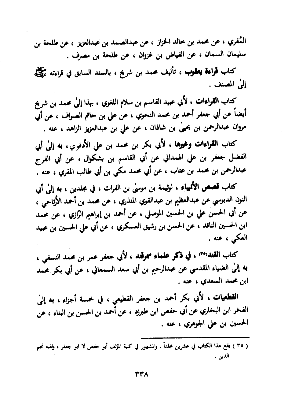 المقري عن محمود بن خالد الخزاز عن عبد الصمد بن عبد العزيز عن طلحة بن سليمان السمان عن الفياض بن غزوان عن طلحة بن مصرف. كتاب قراءة يعقوب تأليف محمد بن شريح بالسند السابق في قراءته صلي الله عليه وسلم الي المصنف كتاب القراءات لأبي عبيد القاسم بن سلام اللغوي بهذا الي محمد بن شريح ايضا عن ابي جعفر بن احمد بن محمد النحوي عن علي بن حاتم الصواف عن ابي مروان عبد الرحمن بن يحيي بن شاذان عن علي بن عبد العزيز الزاهد عنه. كتاب القراءات وغيرها لأبي بكر محمد بن علي الأدفوي به الي ابي الفضل جعفر بن علي الهمداني عن ابي القاسم بن بشكوال عن ابي الفرج عبد الرحمن بن محمد بن عتاب عن ابي محمد مكي بن ابي طالب المقري عنه. كتاب قصص الأنبياء لوثيمة بن موسي بن الفارت في مجلدين به الي ابي النون الدبوسي عن عبد العظيم بن عبد القوي المنذري عن محمد بن احمد الأرتاحي عن ابي الحسن علي بن الحسن الموصلي عن احمد بن ابراهيم الرازي عن محمد ابن الحسين الناقد عن الحسن بن رشيق العسكري عن ابي علي الحسين بن عبيد العكي عنه. كتاب القند في ذكر علماء سمرقند لأبي جعفر عمر بن محمد النسفي به الي الضياء المقدسي عن عبد الرحيم بن ابي سعد السماعني عن ابي بكر محمد ابن محمد السعدي عنه. القطعيات لأبي بكر احمد بن جعفر القطيعي في خمسة اجزاء به الي الفخر ابن البخاري عن ابي حفص ابن طبرزد عن احمد بن الحسن بن البناء عن الحسين بن علي الجوهري عنه.