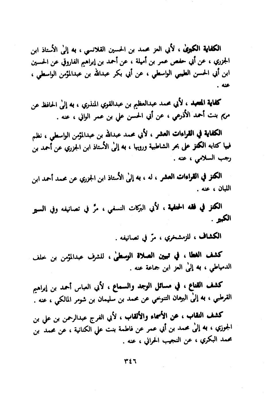الكفاية الكبري لأبي العز محمد بن الحسين القلانسي به الي الأستاذ ابن الجزري عن ابي حفص عمر بن اميلة عن احمد بن ابراهيم الفاروقي عن الحسين ابن ابي الحسن الطيبي الواسطي عن ابي بكر عبد الله بن عبد المؤمن الواسطي عنه. كفاية المتعبد لأبي محمد عبد العظيم بن عبد القوي المنزري به الي الحافظ عن مريم بنت احمد الأذرعي عن ابي الحسن علي بن عمر الواني عنه. الكفاية في القراءات العشر لأبي محمد عبد الله بن عبد المؤمن الواسطي نظم فيها كتابة الكنز علي بحر الشاطبية ورويها به الي الأستاذ ابن الجزري عن احمد بن رجب السلامي عنه. الكنز في القراءات العشر له به الي الأستاذ ابن الجزري عن محمد احمد ابن اللبان عنه. الكنز في فقه الحنفية لأبي البركات النسفي مر في تصانيفه وفي السيرالكبير الكشاف للزمشخري مر في تصانيفه. كشف الغطا في تبيين الصلاة الوسطي للشرف عبد المؤمن بن خلف الدمياطي به الي العز ابن جماعة عنه. كشف القناع في مسائل الوجد والسماع لأبي العباس احمد بن ابراهيم القرطبي به الي البرهان التنوخي عن محمد بن سليمان بن شومر المالكي عنه. كشف النقاب عن الأسماء والألقاب لأبي الفرج عبد الرحمن بن علي بن الجوزي به الي محمد بن ابي عمر عن فاطمة بنت علي الكنانية عن محمد بن محمد البكري عن النجيب الحراني عنه.