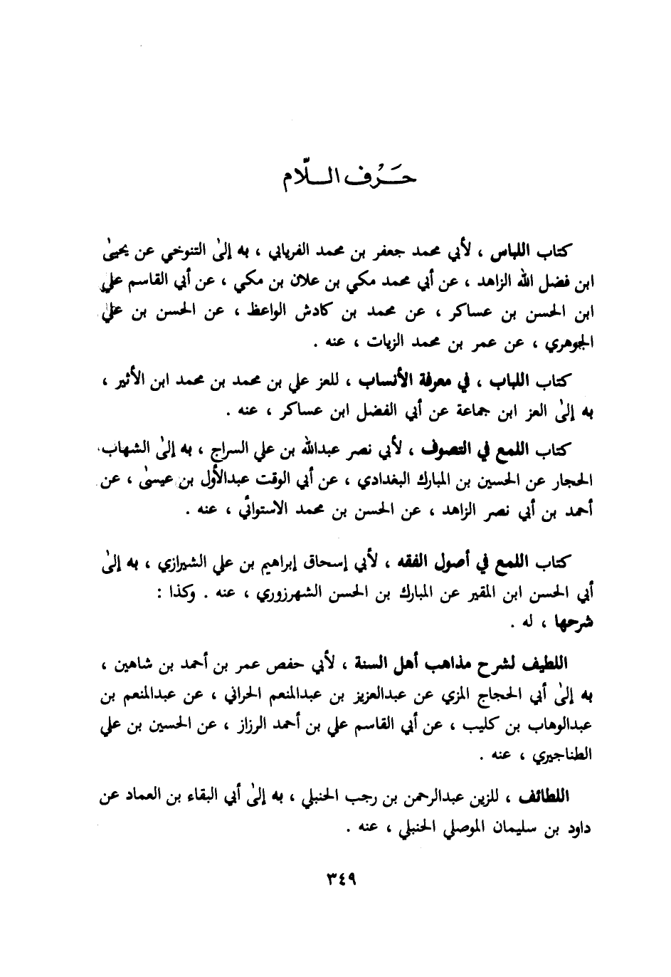 كتاب اللباس لأبي محمد جعفر بن محمد الفريابي به الي التنوخي عن يحيي ابن فضل الله الزاهد عن ابي محمد مكي بن علان بن مكي عن ابي القاسم علي ابن الحسن بن عساكر عن محمد بن كادش الواعظ عن الحسن بن علي الجوهري عن عمر بن محمد الزيات عنه. كتاب اللباب في معرفة الأنساب للعز علي بن محمد بن محمد ابن الأثير به الي العز ابن جماعة عن ابي الفضل ابن عساكر عنه. كتاب اللمع في التصوف لأبي نصر عبد الله بن علي السراج به الي الشهاب الحجار عن الحسين بن المبارك البغدادي عن ابي الوقت عبد الأول بن عيسي عن احمد بن ابي نصر الزاهد عن الحسن بن محمد الاستوائي عنه. كتاب اللمع في اصول الفقه لأبي اسحاق ابراهيم بن علي الشيرازي به الي ابي الحسن ابن المقير عن المبارك بن الحسن الشهرزوري عنه وكذا: شرحها له. اللطيف لشرح مذاهب اهل السنة لأبي حفص عمر بن احمد بن شاهين به الي ابي الحجاج المزي عن عبد العزيز بن عبد المنعم الحراني عن عبد المنعم بن عبد الوهاب بن كليب عن ابي القاسم علي بن احمد الرزاز عن الحسين بن علي الطناجيري عنه. اللطائف للزين عبد الرحمن بن رجب الحنبلي به الي ابي البقاء بن العماد عن داود بن سليمان الموصلي الحنبلي عنه.