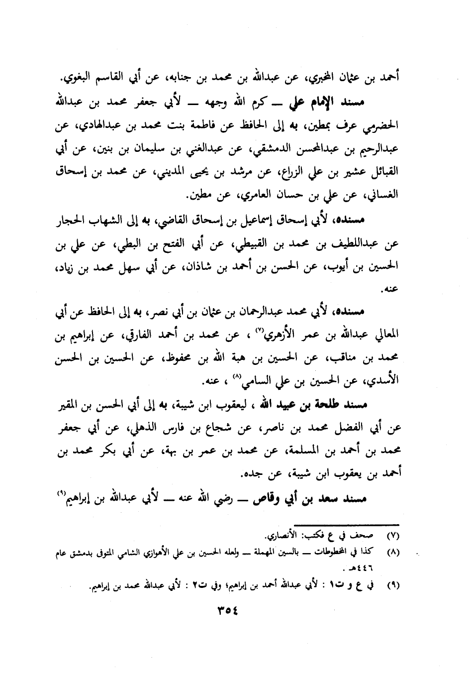 احمد بن عثمان المخبري عن عبد الله بن محمد بن جنابه عن ابي القاسم البغوي مسند الإمام علي – كرم الله وجهه – لأبي جعفر محمد بن عبد الله الخضرمي عرف بمطين به الي الحافظ عن قاطمة بنت محمد بن عبد الهادي عن عبد الرحيم بن عبد المحسن الدمشقي عن عبد الغني بن سليمان بن بنين عن ابي القبائل عشير بن علي الزراع عن مرشد بن يحيي المديني عن محمد بن اسحاق الغساني عن علي بن حسان العامري عن مطين. مسنده لأبي اسحاق اسماعيل بن اسحاق القاضي به الي الشهاب الحجار عن عبد اللطيف بن محمد بن القبيطي عن ابي الفتح بن البطي عن علي بن الحسين بن ايوب عن الحسن بن احمد بن شاذان عن ابي سهل محمد بن زياد عنه. مسنده لأبي محمد عبد الرحمان بن عثمان بن ابي نصر به الي الحافظ عن ابي المعالي عبد الله بن عمر الأزهري عن محمد بن احمد الفارقي عن ابراهيم بن محمد بن مناقب عن الحسين بن هبة الله بن محفوظ عن الحسين بن الحسن الأسدي عن الحسين بن علي السامي عنه. مسند طلحة بن عبيد الله ليعقوب ابن شيبة به الي ابي الحسن بن المقير عن ابي الفضل محمد بن ناصر عن شجاع بن فارس الذهلي عن ابي جعفر محمد بن احمد بن المسلمة عن محمد بن عمر بن بهة عن ابي بكر محمد بن احمد بن يعقوب ابن شيبة عن جده. مسند سعد بن ابي وقاص – رضي الله عنه – لأبي عبد الله بن ابراهيم