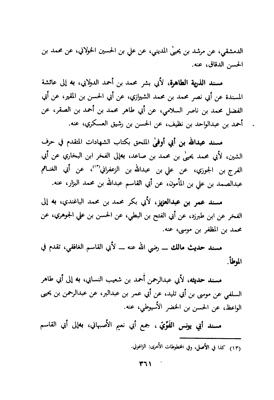 الدمشقي عن مرشد بن يحيي المديني عن علي بن الحسين الخولاني عن محمد بن الحسن الدقاق عنه. مسند الذرية الطاهرة لأبي بشر محمد بن احمد الدولابي به الي عائشة المسندة عن ابي نصر محمد بن محمد الشيرازي عن ابي الحسن بن المقير عن ابي الفضل محمد بن ناصر السلامي عن ابي طاهر محمد بن احمد بن الصقر عن احمد بن عبد الواحد بن نظيف عن الحسن بن رشيق العسكري عنه. مسند عبد الله بن ابي اوفي الملحق بكتاب الشهادات المتقدم في حرف الشين لأبي محمد يحيي بن محمد بن صاعد به الي الفخر ابن البخاري عن ابي الفرج بن الجوزي عن علي بن عبد الله بن الزعفراني عن ابي الغنائم عبد الصمد بن علي بن المأمون عن ابي القاسم عبد الله بن محمد البزار عنه مسند عمر بن عبد العزيز لأبي بكر محمد بن محمد الباغندي به الي الفخر عن ابن طبرزد عن ابي الفتح بن البطي عن الحسن بن علي الجوهري عن محمد بن المظفر بن موسي عنه. مسند حديث مالك – رضي الله عنه – لأبي القاسم الغافقي تقدم في الموطأ. مسند حديثه لأبي عبد الرحمن احمد بن شعيب النسابي به الي ابي طاهر السلفي عن موسي بن ابي تليد عن ابي عمر بن عبد البر عن عبد الرحمن بن يحيي الواعظ عن الحسن بن الخضر الأسيوطي عنه. مسند ابي يونس الفوي جمع ابي نعيم الأصبهاني به الي ابي القاسم