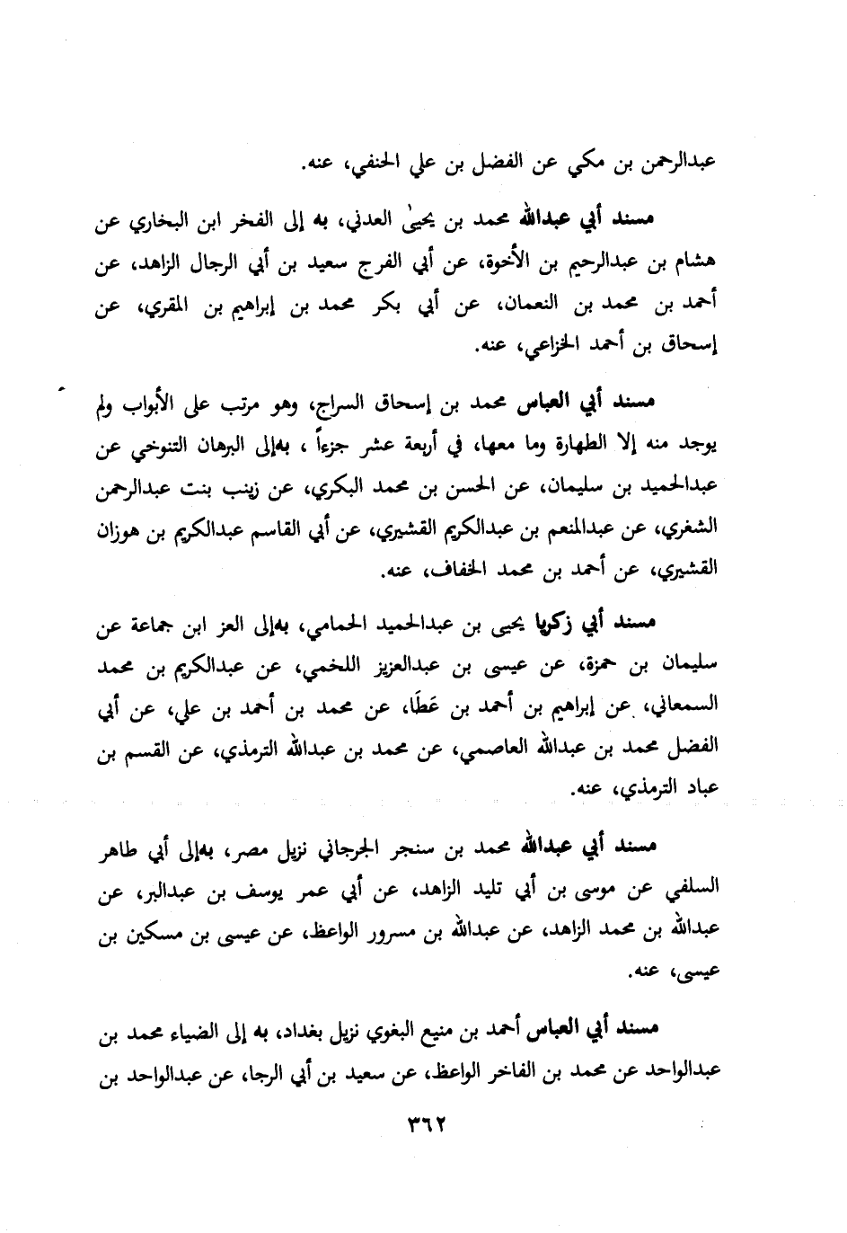 عبد الرحمن بن مكي عن الفضل بن علي الحنفي عنه. مسند ابي عبد الله محمد بن يحيي العدني به الي الفخر ابن البخاري عن هشام بن عبد الرحيم بن الأخوة عن ابي الفرج سعيد بن ابي الرجال الزاهد عن احمد بن محمد بن النعمان عن ابي بكر محمد بن ابراهيم بن المقري عن اسحاق بن احمد الخزاعي عنه. مسند ابي العباس محمد بن اسحاق السراج وهو مرتب علي الأبواب ولم يوجد منه الا الطهارة وما معها في اربعة عشر جزءا به الي البرهان التنوخي عن عبد الحميد بن سليمان عن الحسن بن محمد البكري عن زينب بنت عبد الرحمن الشغري عن عبد المنعم بن عبد الكريم القشيري عن ابي القاسم عبد الكريم بن هوزان القشيري عن احمد بن محمد الخفاف عنه. مسند ابي زكريا يحيي بن عبد الحميد الحمامي به الي العز ابن جماعة عن سليمان بن حمزة عن عيسي بن عبد العزيز اللخمي عن عبد الكريم بن محمد السمعاني عن ابراهيم بن احمد بن عطا عن محمد بن احمد بن علي عن ابي الفضل محمد بن عبد الله العاصمي عن محمد بن عبد الله الترمذي عن القسم بن عباد الترمذي عنه. مسند ابي عبد الله محمد بن سنجر الجرجاني نزيل مصر به الي ابي طاهر السلفي عن موسي بن ابي تليد الزاهد عن ابي عمر يوسف بن عبد البر عن عبد الله بن محمد الزاهد عن عبد الله بن مسرور الواعظ عن عيسي بن مسكين بن عيسي عنه. مسند ابي العباس احمد بن منيع نزيل بغداد به الي الضياء محمد بن عبد الواحد عن محمد بن الفاخر الواعظ عن سعيد بن ابي الرجا عن عبد الواحد بن