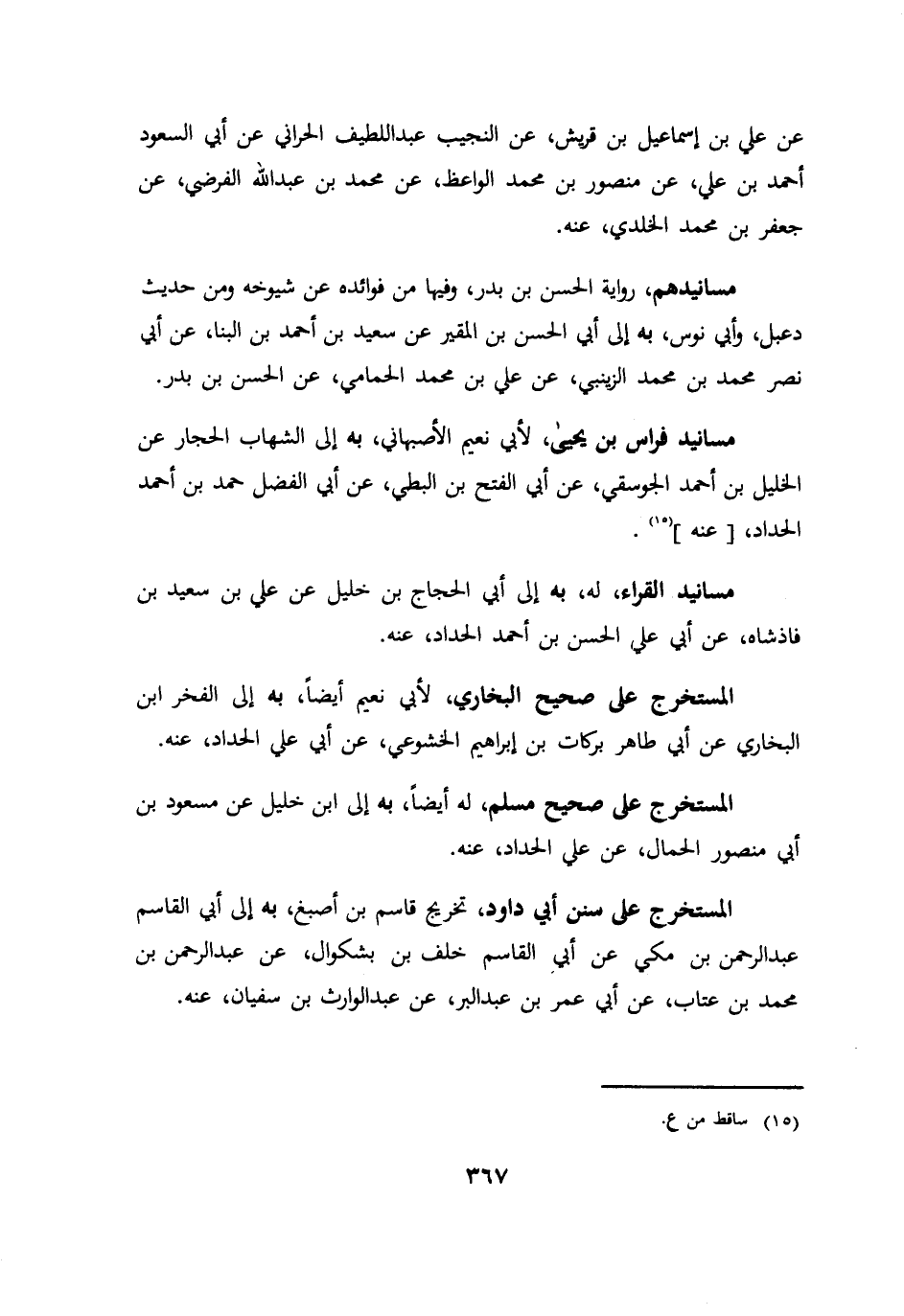 عن علي بن اسماعيل بن قريش عن النجيب عبد اللطيف الحراني عن ابي السعود احمد بن علي عن منصور بن محمد الواعظ عن محمد بن عبد الله الفرضي عن جعفر بن محمد الخلدي عنه. مسانيدهم رواية الحسن بن بدر وفيها من فوائده عن شيوخه ومن حديث دعبل وابي نوس به الي ابي الحسن بن المقير عن سعيد بن احمد بن البناء عن ابي نصر محمد بن محمد الزينبي عن علي بن محمد الحمامي عن الحسن بن بدر مسانيد فراس بن يحيي لأبي نعيم الأصبهاني به الي الشهاب الحجار عن الخليل بن احمد الجوسقي عن ابي الفتح بن البطي عن ابي الفضل حمد بن احمد الحداد عنه. مسانيد القراء له به الي ابي الحجاج بن خليل عن علي بن سعيد فاذشاه عن ابي علي الحسن بن احمد الحداد عنه. المستخرج علي صحيح البخاري لأبي نعيم ايضا به الي الفخر ابن البخاري عن ابي طاهر بركات بن ابراهيم الخشوعي عن ابي علي الحداد عنه المستخرج علي صحيح مسلم له ايضا به الي ابن خليل عن مسعود بن ابي منصور الحمال عن علي الحداد عنه. المستخرج علي سنن ابي داود تخريج قاسم بن اصبغ به الي ابي القاسم عبد الرحمن بن مكي عن ابي القاسم خلف بن بشكوال عن عبد الرحمن بن محمد بن عتاب عن ابي عمر بن عبد البر عن عبد الوارث بن سفيان عنه.