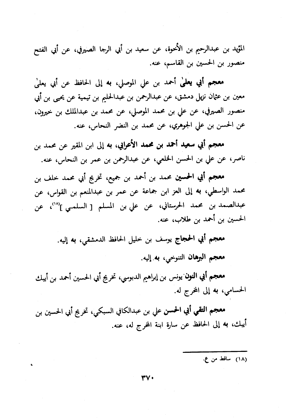 المؤيد بن عبد الرحيم بن الاخوة عن سعيد بن ابي الرجا الصيرفي عن ابي الفتح منصور بن الحسن بن القاسم عنه معجم ابي يعلي احمد بن علي الموصلي به الي الحافظ عن ابي يعلي معين بن عثمان نزيل دمشق عن عبد الرحمن بن عبد الحليم بن تيمية عن يحيي بن ابي منصور الصيرفي عن علي بن محمد الموصلي عن محمد بن عبد الملك بن خيرون عن الحسن بن علي الجوهري عن محمد بن النضر النحاس عنه معجم ابي سعيد احمد بن محمد الأعرابي به الي ابن المقير عن محمد بن ناصر عن علي بن الحسن الخلعي عن عبد الرحمن بن عمر بن النحاس عنه. معجم ابي الحسين محمد بن احمد بن جميع تخريج ابي محمد خلف بن محمد الواسطي به الي العز ابن جماعة عن عمر بن عبد المنعم بن القواس عن عبد الصمد بن محمد الحرستاني عن علي بن المسلم السلمي عن الحسين بن احمد بن طلاب عنه. معجم ابي الحجاج يوسف بن خليل الحافظ الدمشقي به اليه معجم البرهان التنوخي به اليه معجم ابي النون يونس بن ابراهيم الدبوسي تخريج ابي الحسين احمد بن ايبك الحسامي به الي المخرج له معجم التقي ابي الحسن علي بن عبد الكافي السبكي تخريج ابي الحسين بن ايبك به الي الحافظ عن سارة ابنة المخرج له عنه.